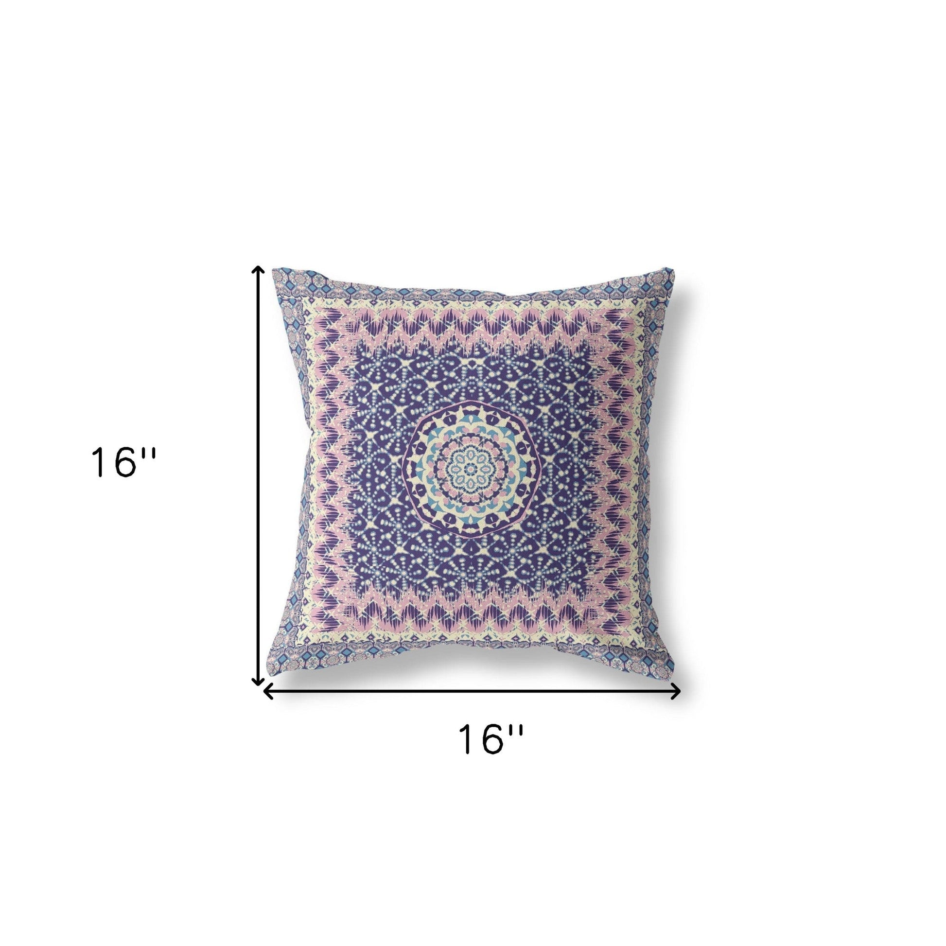 This Pink Indigo Holy Floral Indoor Outdoor Throw Pillow will brighten up your living room with a classic bohemian charm. Pulsating with lovely shades of pink, cream, and indigo, this pillow showcases intricate geometric patterns with floral detailing that makes this pillow a stunning décor to update your boho-chic interior. The pillow has the softest touch and enhanced durability because of its premium broadcloth fabric, making it a perfect accent for indoor and outdoor use. The high-quality polyfill insert makes the pillow super soft and cozy with fluffy nature to maximize comfort. If you want a luxurious and classy piece of décor in your home, this decorative throw pillow is sure to draw your attention. 16” x 16” x 5”