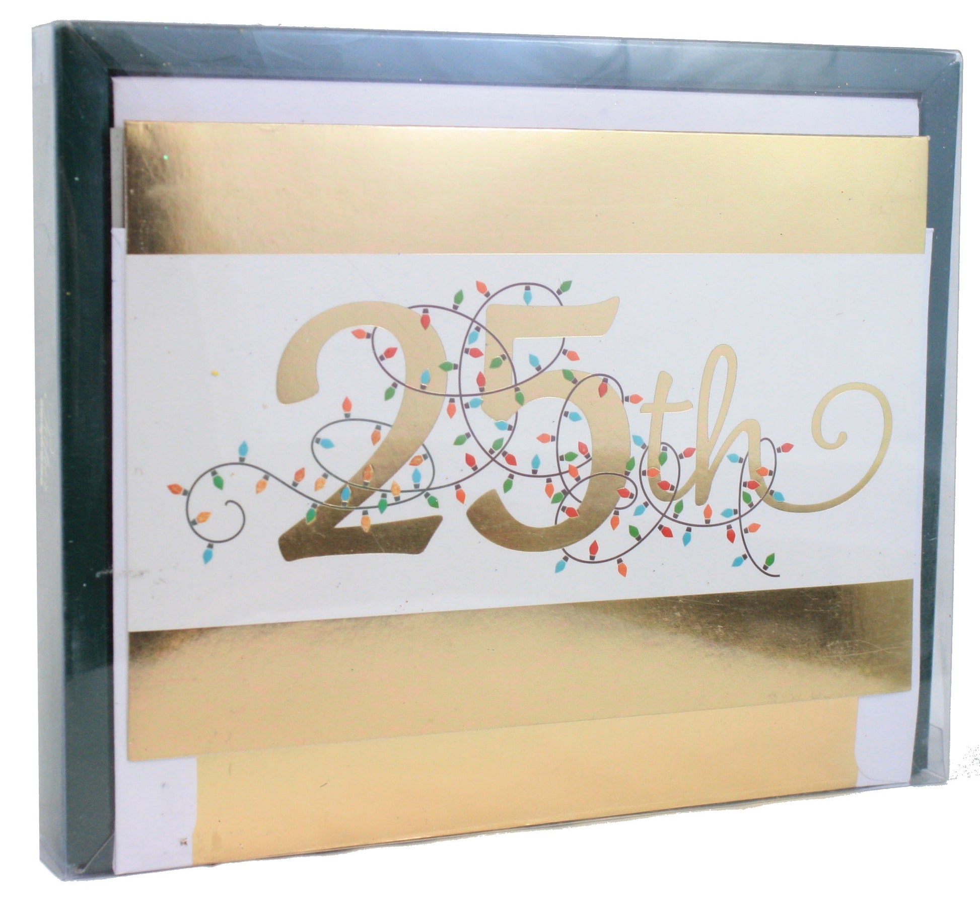 Celebrate the magic of Christmas Day with these elegant "25th" Greeting Cards. Perfect for commemorating the significance of December 25th, these cards feature a beautifully designed "25th" adorned with delicately illustrated holiday lights, adding a whimsical touch to the sophisticated gold script. The luxurious gold foil accents and border provide an exquisite and timeless look that will surely stand out.