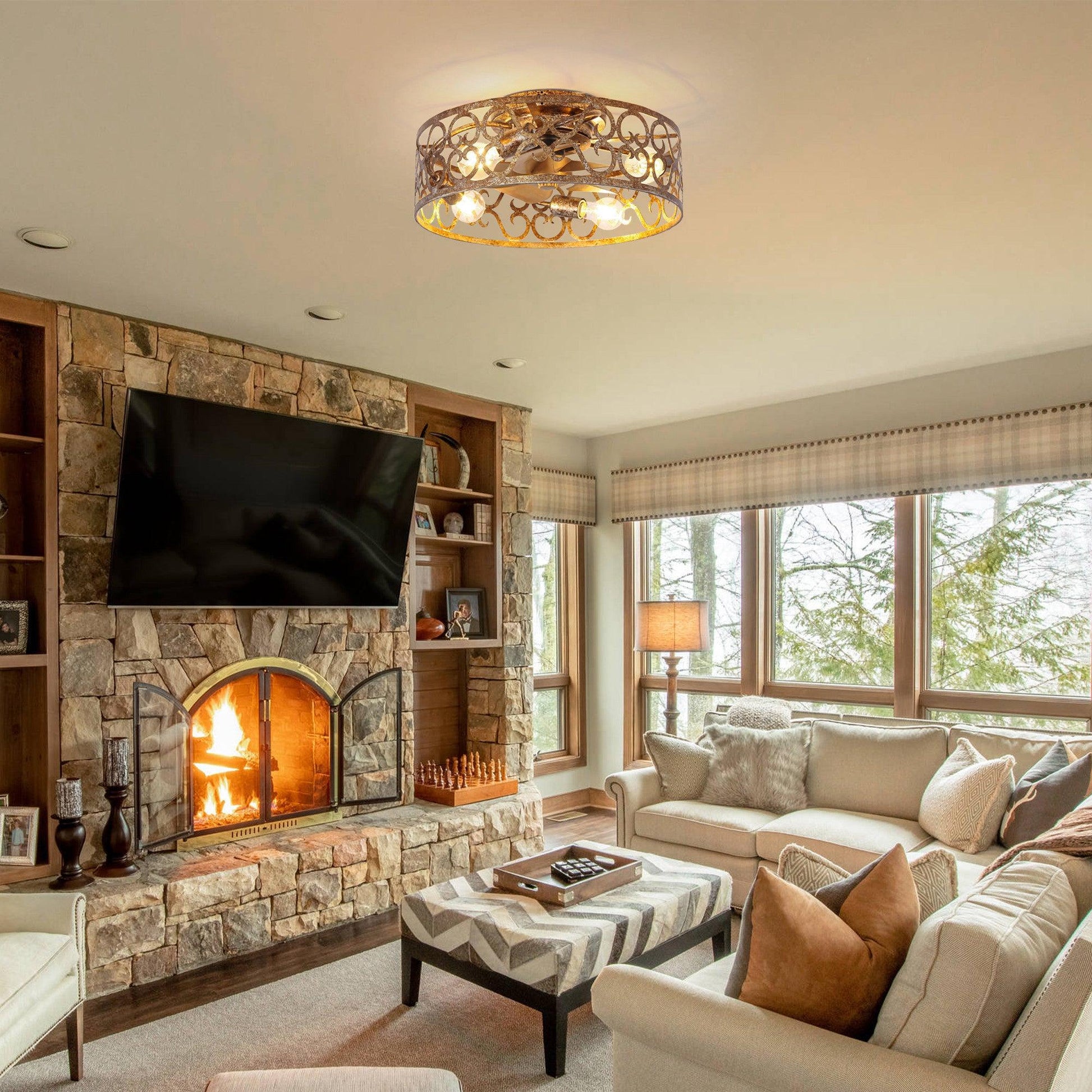 18-inch golden flush mount ceiling fan with light, the perfect fusion of smart home and retro industrial style.