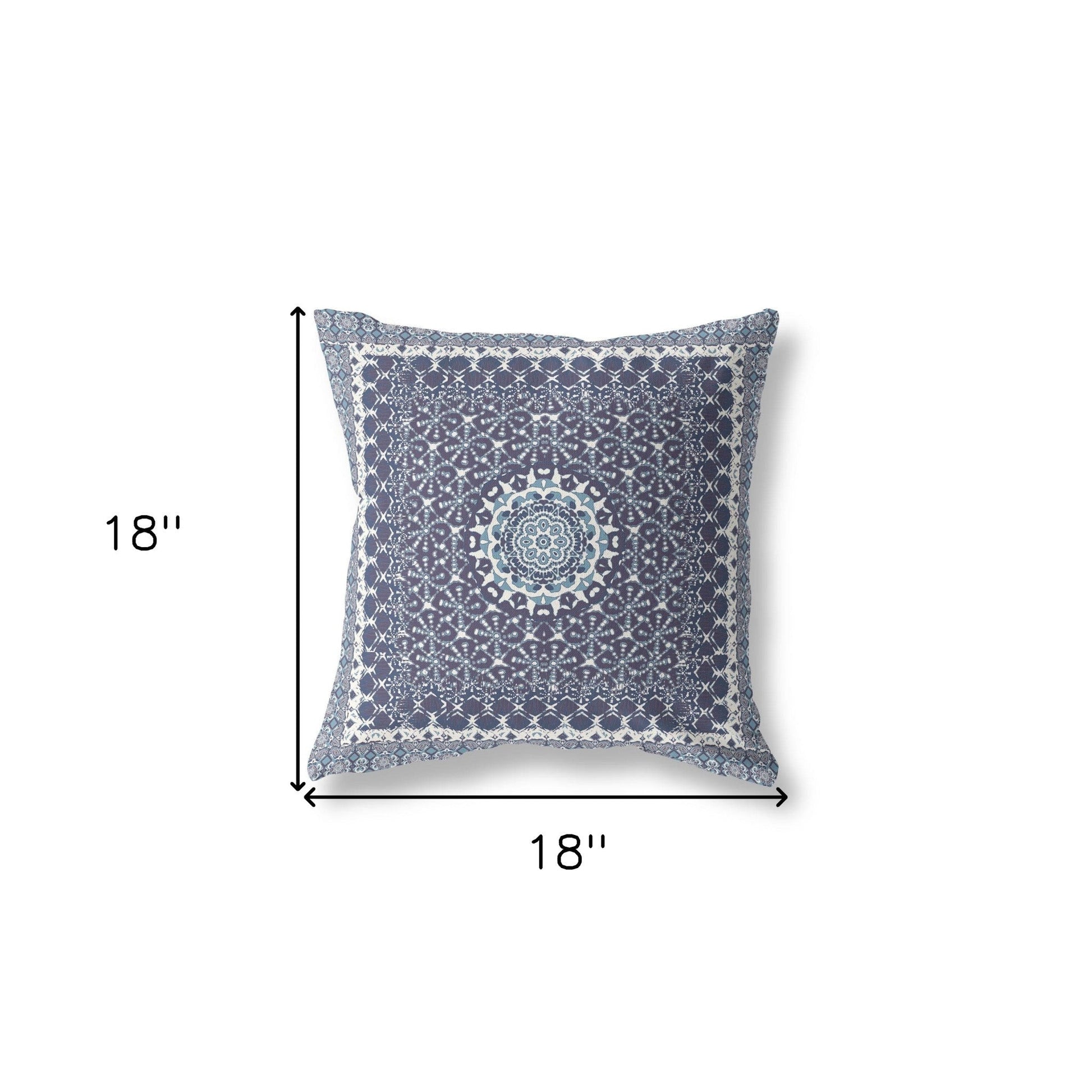 Embracing timeless traditional appeal with bohemian charm, this Slate Blue Holy Floral Indoor Outdoor Throw Pillow is meant to uplift your living space and stay in style forever. The slate blue base is intricately embellished with geometric patterns in soft shades of blue and white, creating a holy floral design that is sure to allure the gaze. The sturdy construction of the pillow can be attributed to its durable broadcloth cover which is not only soft to the touch but also easy to clean, making it an ideal piece of décor for both indoor and outdoor settings. This blown and closed pillow is filled with a soft polyester filling that adds to the fluffy look while providing maximum comfort. Embodying a sense of luxury in its decorative detailing, this throw pillow will be an element of class and comfort to your boho-chic home. 18” x 18” x 5”