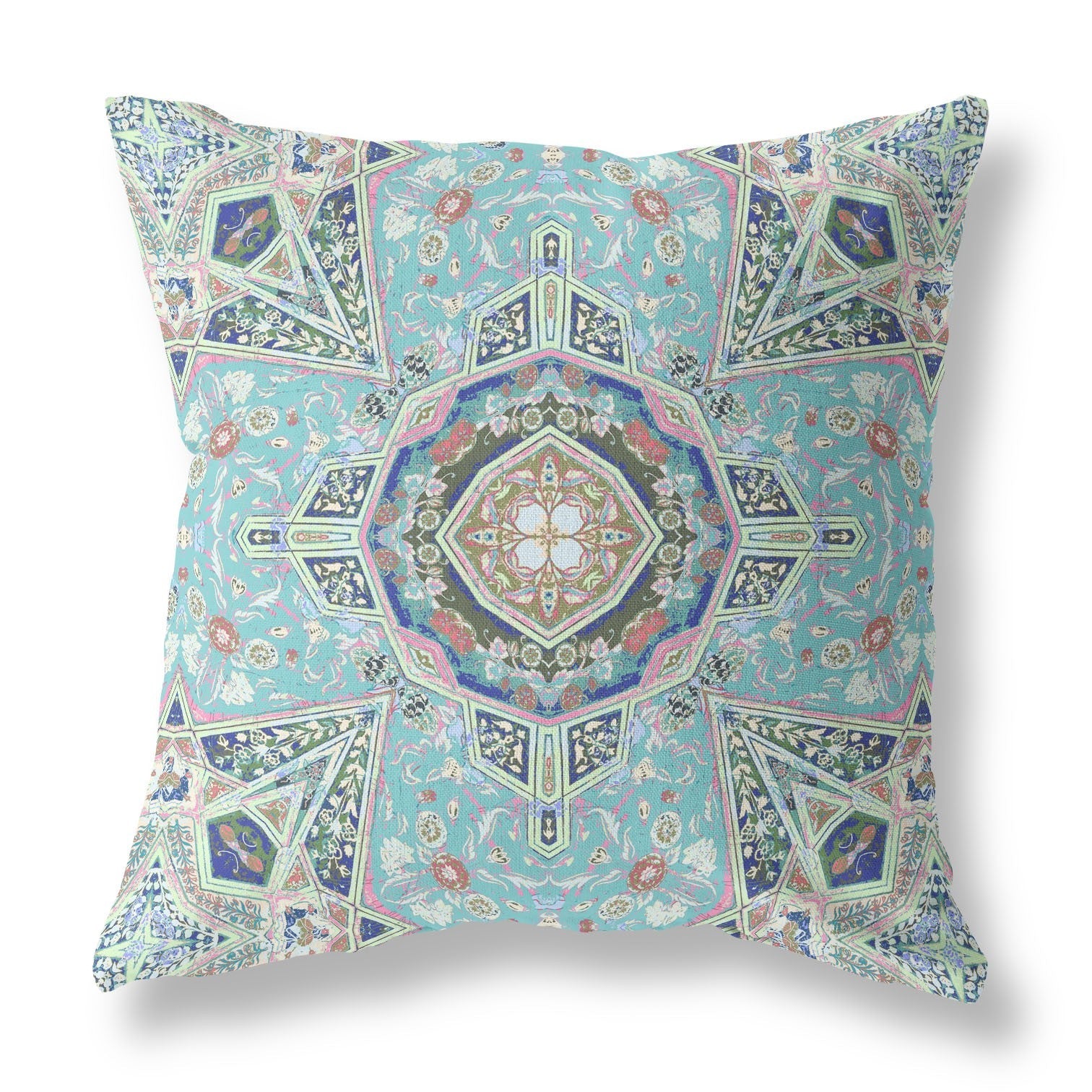 Let a calm and comforting energy flow through your living space with this Aqua Brown Floral Geo Indoor Outdoor Zippered Throw Pillow that brings out the inner zen of your home. The soft-tone pastel palette elevates the details in the calming shades of aqua blue with hints of pink, white, brown, and beige to create an alluring geometric design for visual interest. Crafted from premium quality broadcloth fabric to ensure a sturdy construction with a soft hand, making it an ideal accent to add a plush look to your indoor and outdoor settings. The immaculate look of the high-quality print on this pillow is sure to stay vibrantfor ages. The soft polyester fill insert gives this zippered throw pillow a cozy and fluffy look for long relaxation sessions or to beautify your home. If you want a peaceful ambiance in your space, go for this eye-soothing decorative throw pillow to anchor your living room. 18” x 18” x 5”