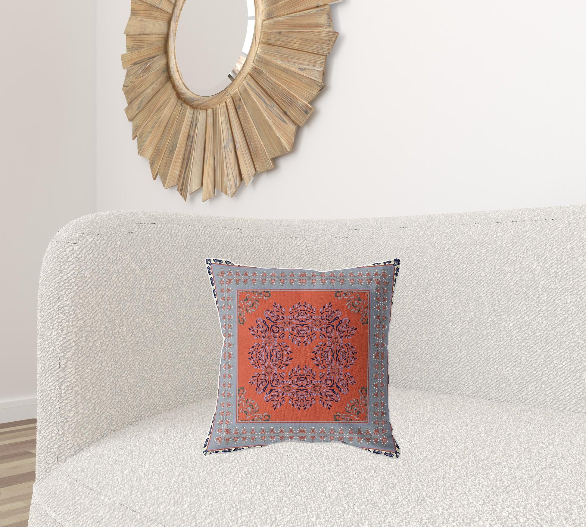 18" X 18" Orange And Gray Blown Seam Floral Indoor Outdoor Throw Pillow