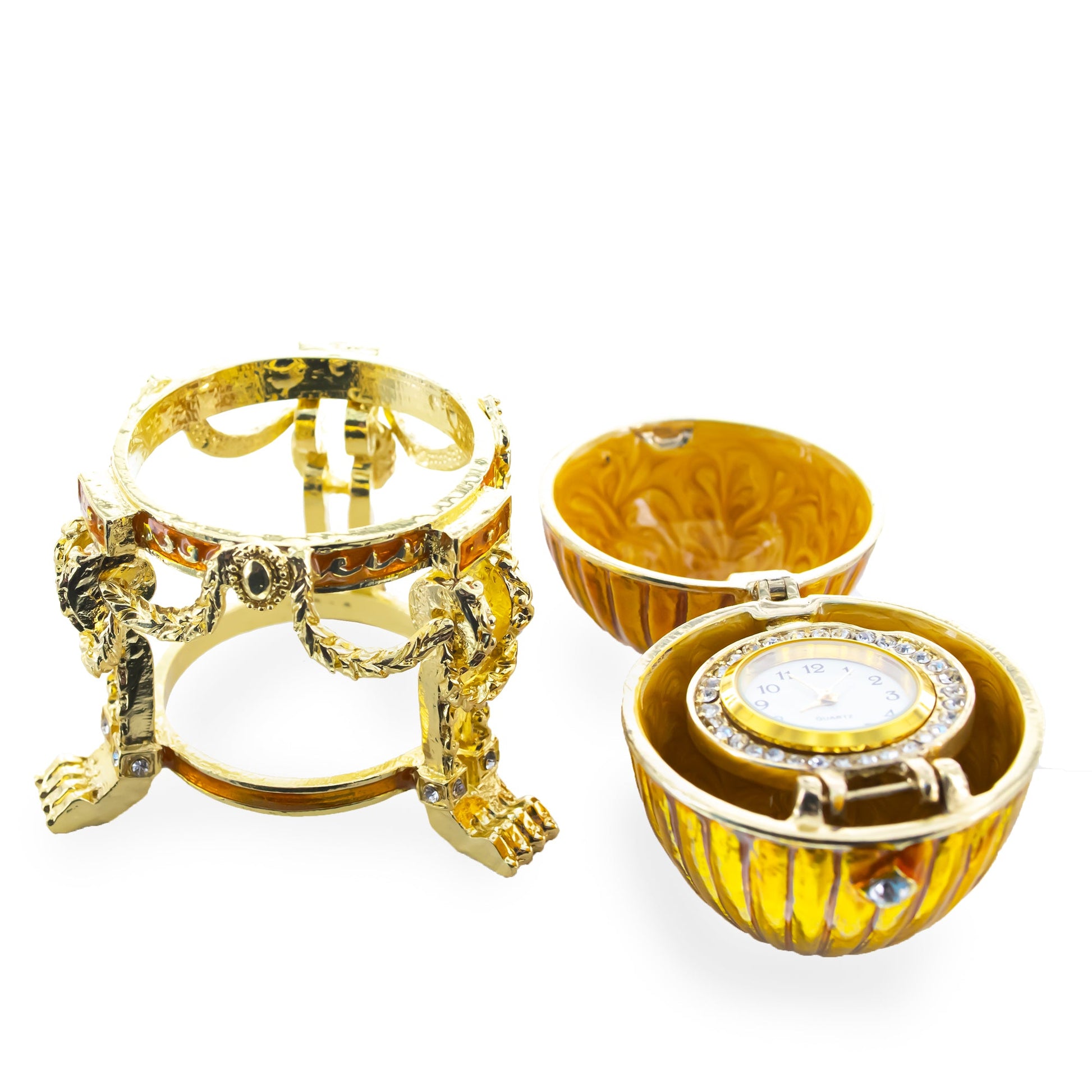 This hand-painted sparkling egg is adorned with a high-polished enamel with golden trim. The egg opens on a hinge and closes shut with a magnet, to keep the box securely shut.