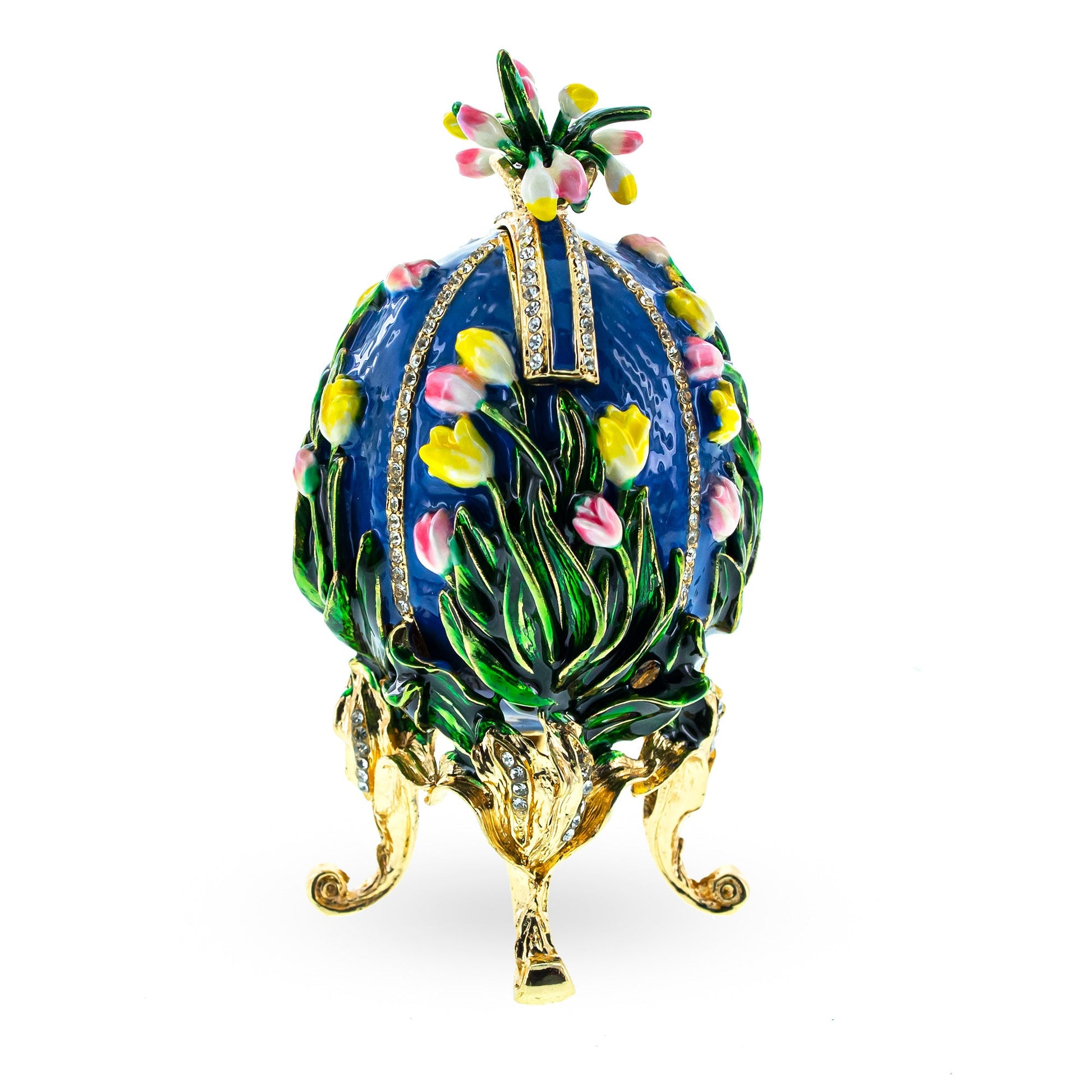 This sparkling egg is adorned with clear crystals and high-polished enamel with golden trim. The top slides out to expose a triple round picture frame and has a magnetic closure to keep the box securely shut.