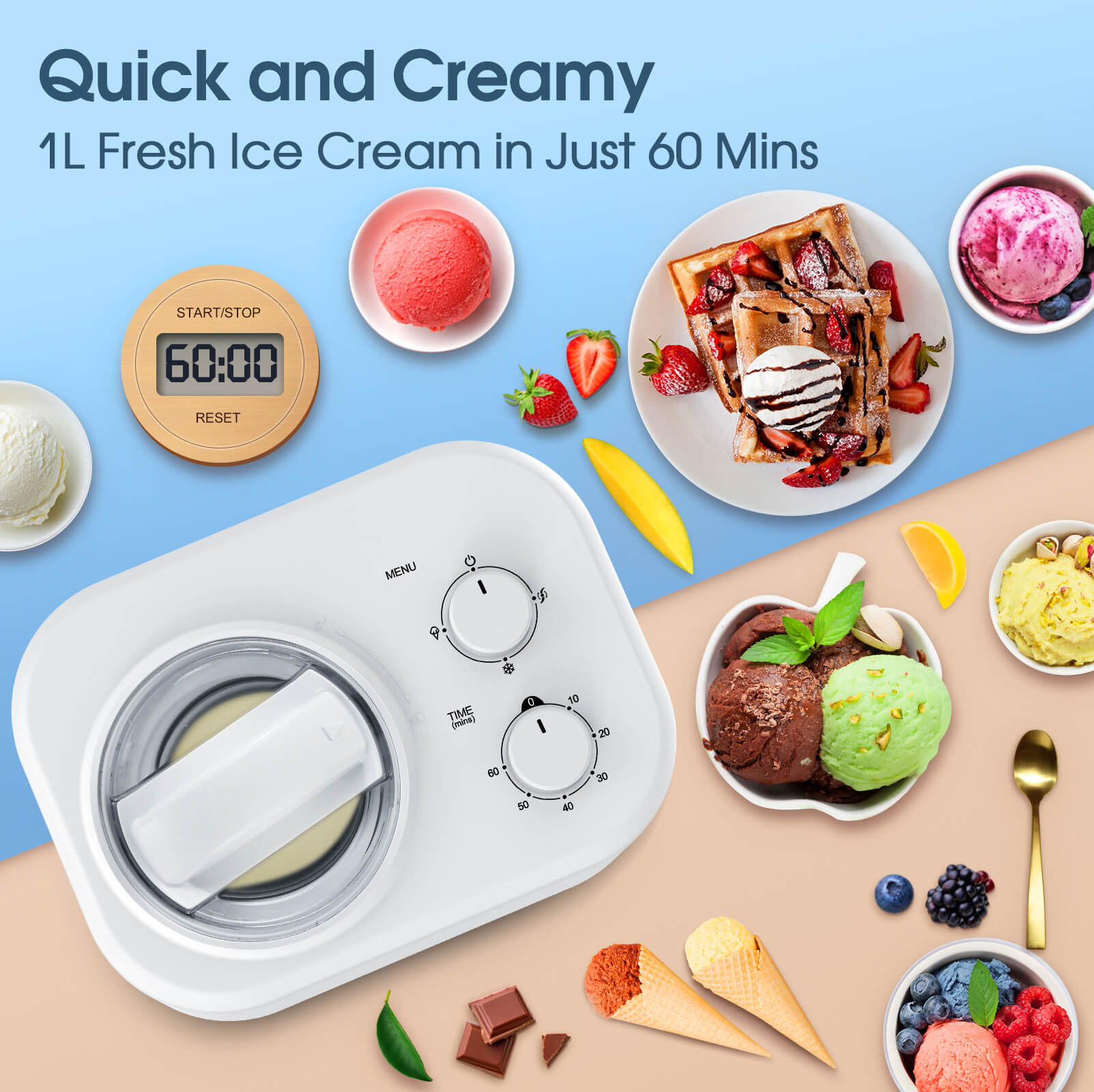 - With a 1L capacity, our ice cream maker quickly produces creamy desserts in under an hour, perfect for gatherings or indulging with loved ones.