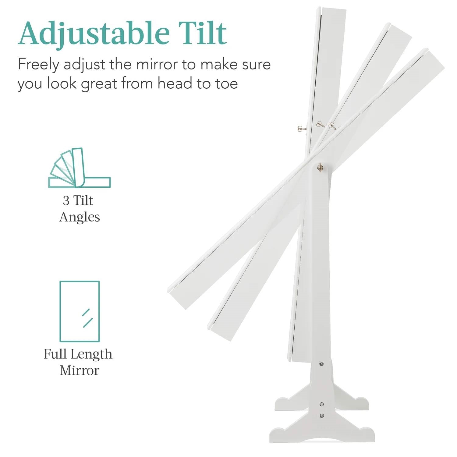 This 2-in-1 White Freestanding Mirror / Jewelry Organizer Armoire Cabinet adds an elegant touch to any bedroom, bathroom, or morning prep space and comes in a variety of colors to complement any home aesthetic. Answer all your storage needs with 2 cubbies, 5 makeup shelves, and dedicated spaces like 36 necklace hooks, 98 ring slots, 120 earring hooks, 60 stud holes, and a bracelet rod! A set of pegs and fastener holes on the legs let you adjust the angle of this mirror to 3 different positions to achieve the best head-to-toe view of your outfit. A built-in lock helps protect your jewelry-keep your most precious accessories out of the reach of children and perfectly organized for easy access. A sturdy, engineered wood construction provides durable storage, while a soft velvet lining creates a luxurious home for your finest jewelry.