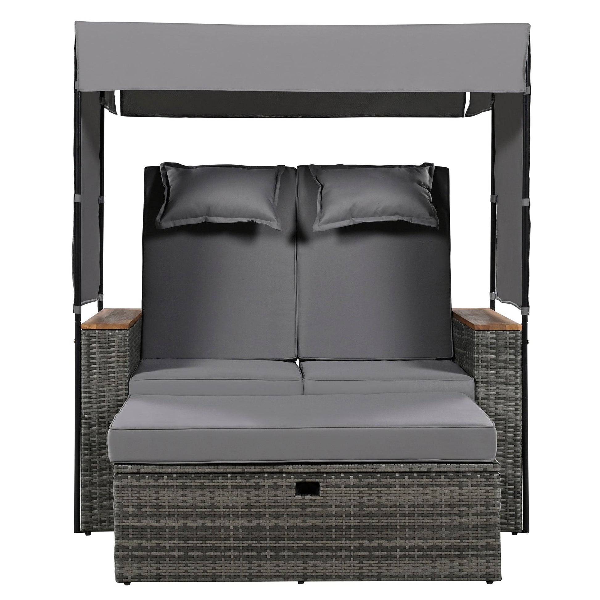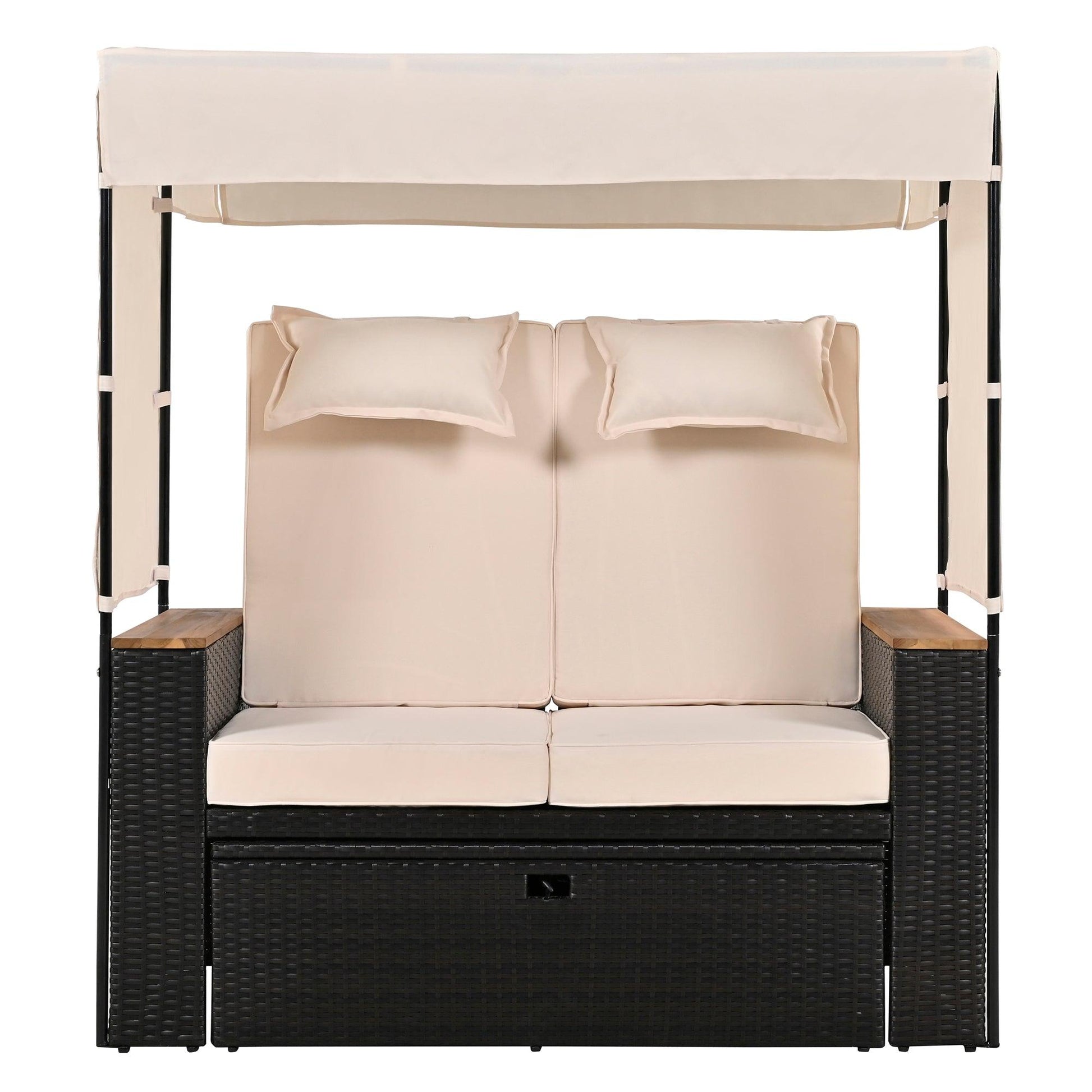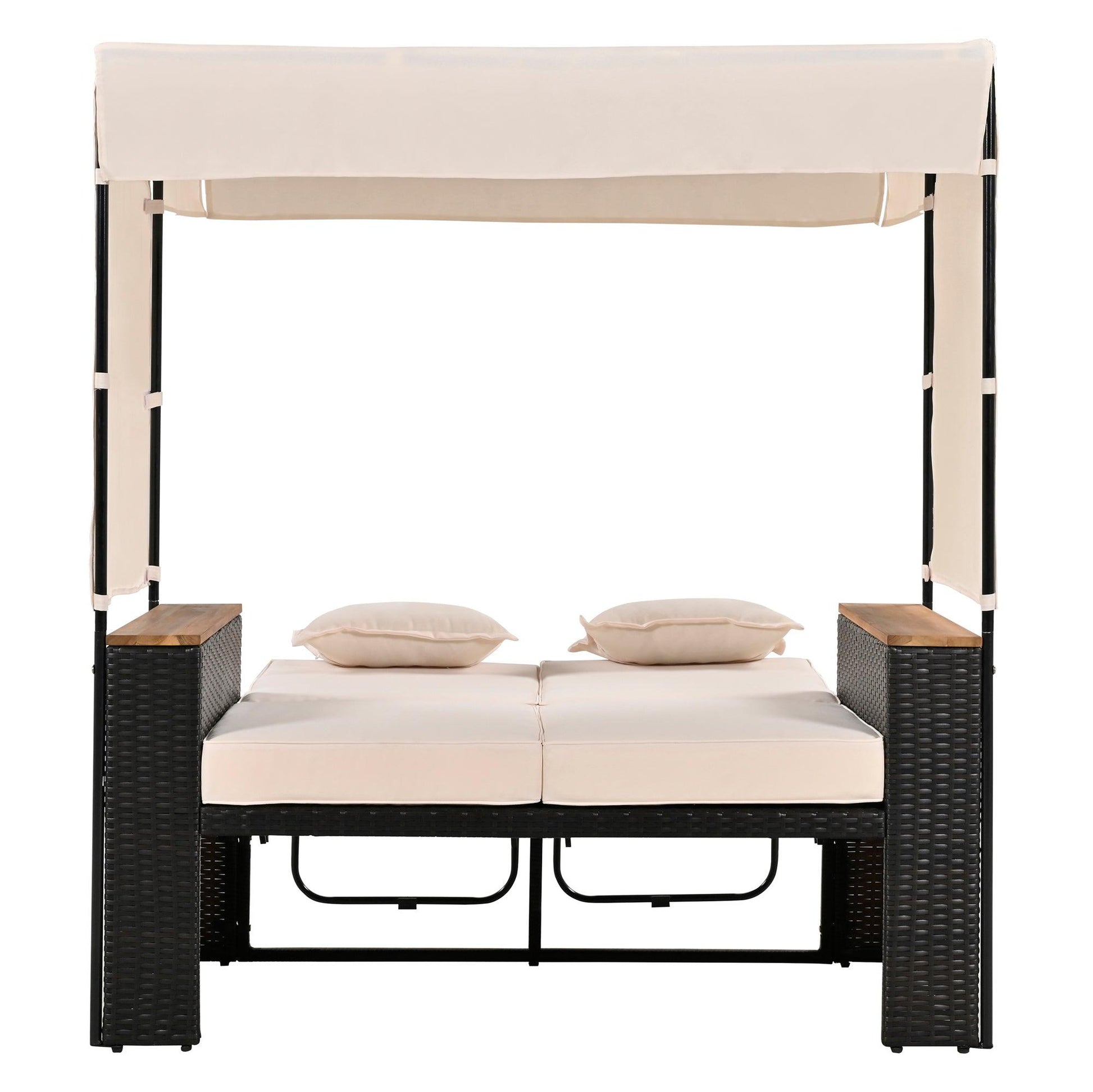 2-Piece Outdoor Rattan Daybed with Bench Lounge Roof Set and Cushions for Poolside, Backyard and Garden