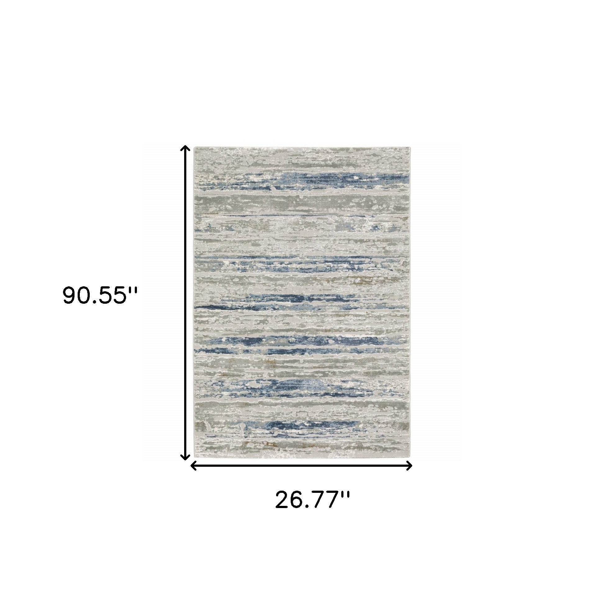 Add some artistry to your room with this 2' x 8' grey blue light blue ivory and brown abstract power loom stain resistant runner rug. This runner shaped rug features a abstract design in grey blue light blue ivory and brown to give it visual interest. A classic shape marries with good looking design for your space Ideal for spaces with kids and pets, this rug is stain resistant to help repel stains and spilled liquids. Area Rugs help to give warmth and sense of home to your space. 1" H x 26.77" W x 90.55" D