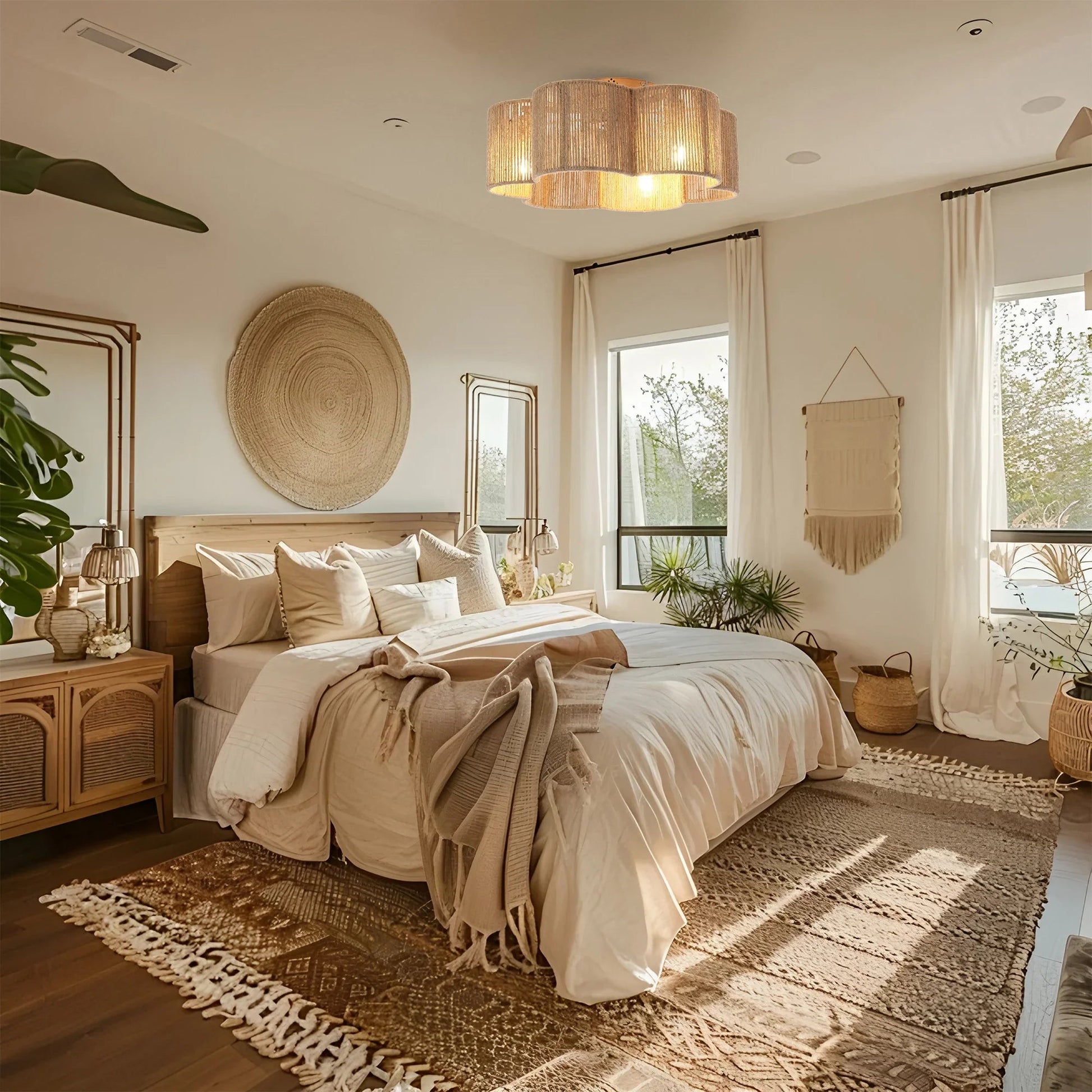 21 Inch Golden Flower-shape Farmhouse Rattan Flush Mount Ceiling Fan with Light APP and Remote Control