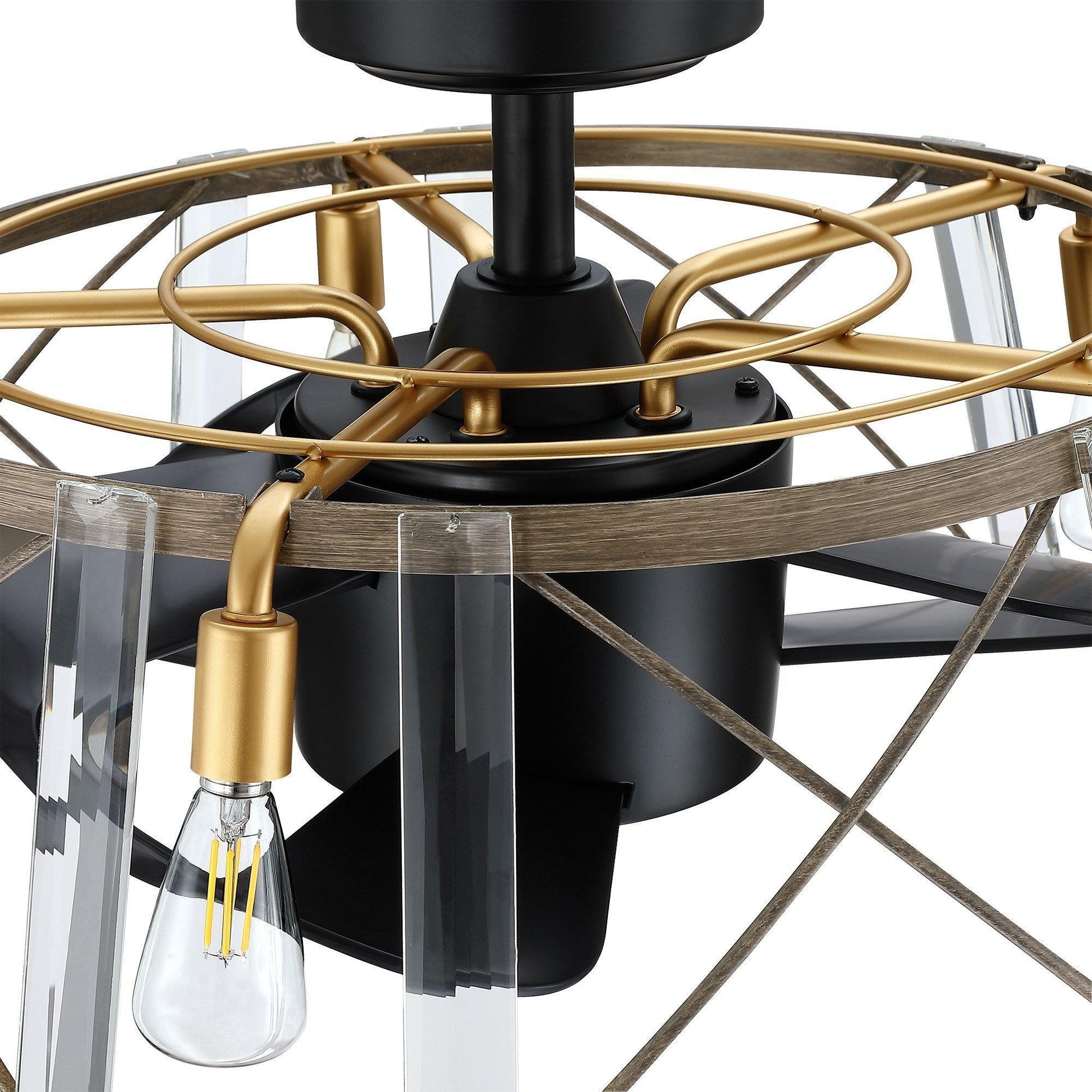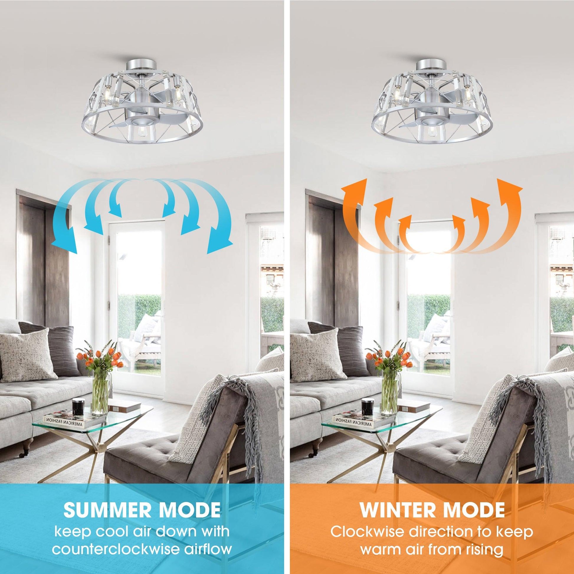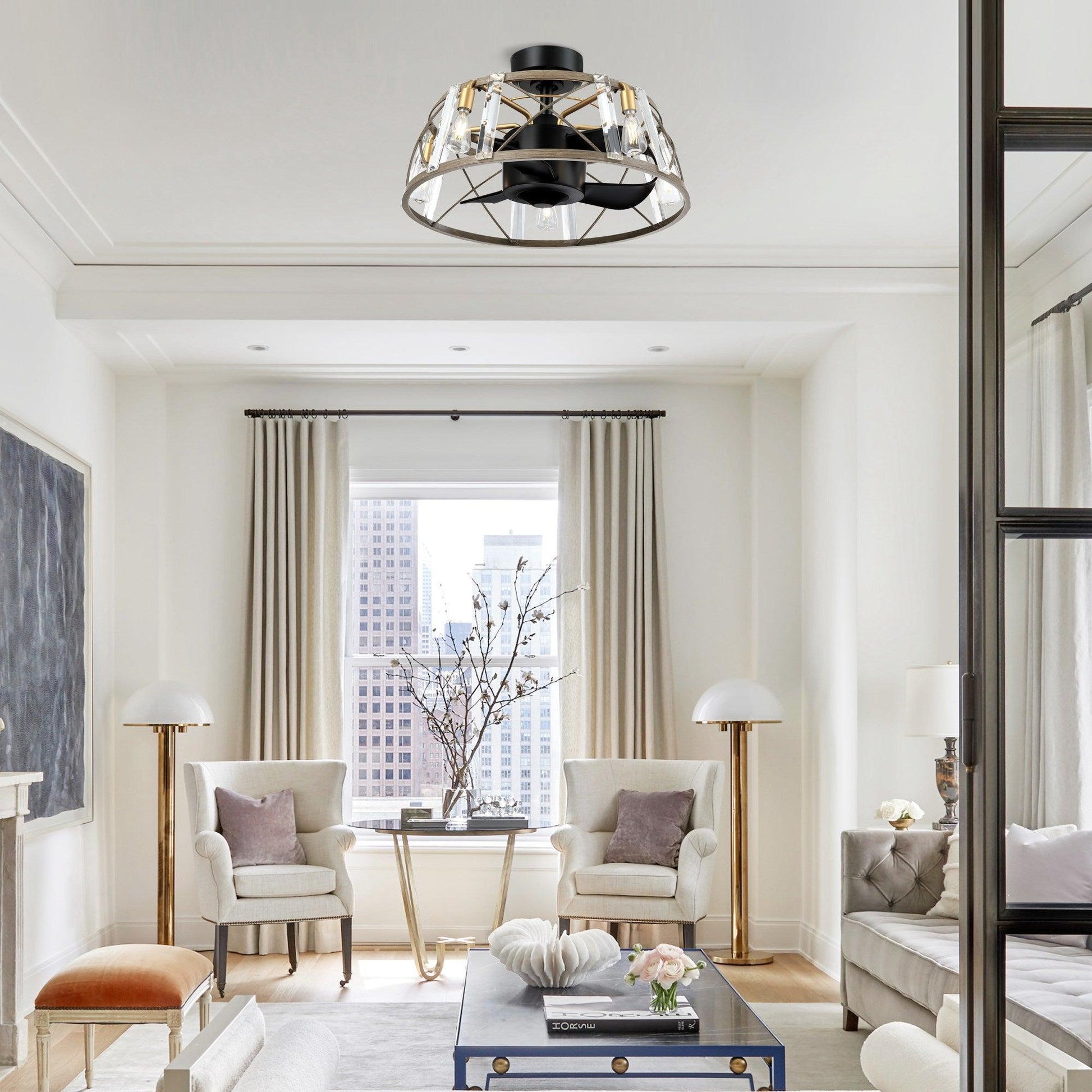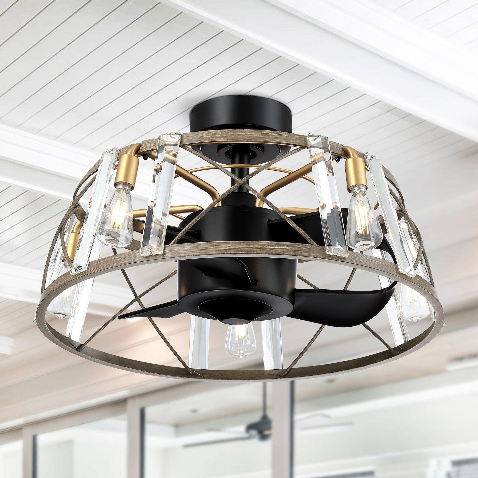 This 23" fandelier farmhouse ceiling fan with lights is set with hanging high-quality crystal, 3 ABS retractable blades, a high-quality metal base, and a woody light shade. The drum-shaped round lampshade, which merges farmhouse and retro elements, is low-key and luxurious, very suitable for Industrial style indoor spaces, such as bedrooms, living rooms, dining rooms, corridors, etc. And it can turn on the lights separately when you turn off the fan. The small-size fan blades made with ABS are safer and more stable than other fan lights while ensuring functionality, which also makes them the ideal ceiling fan for your home. It features a reversible, multiple-speed-powerful motor, and delivers an ultra-powerful airflow with quiet performance. It can be run in the winter to aid in rotating warm air and cutting down on energy costs. The reverse airflow feature allows you to quickly change the direction of the fan, for proper distribution of air. All functions of our ceiling fan with lights and remote can be easily controlled by the remote control.