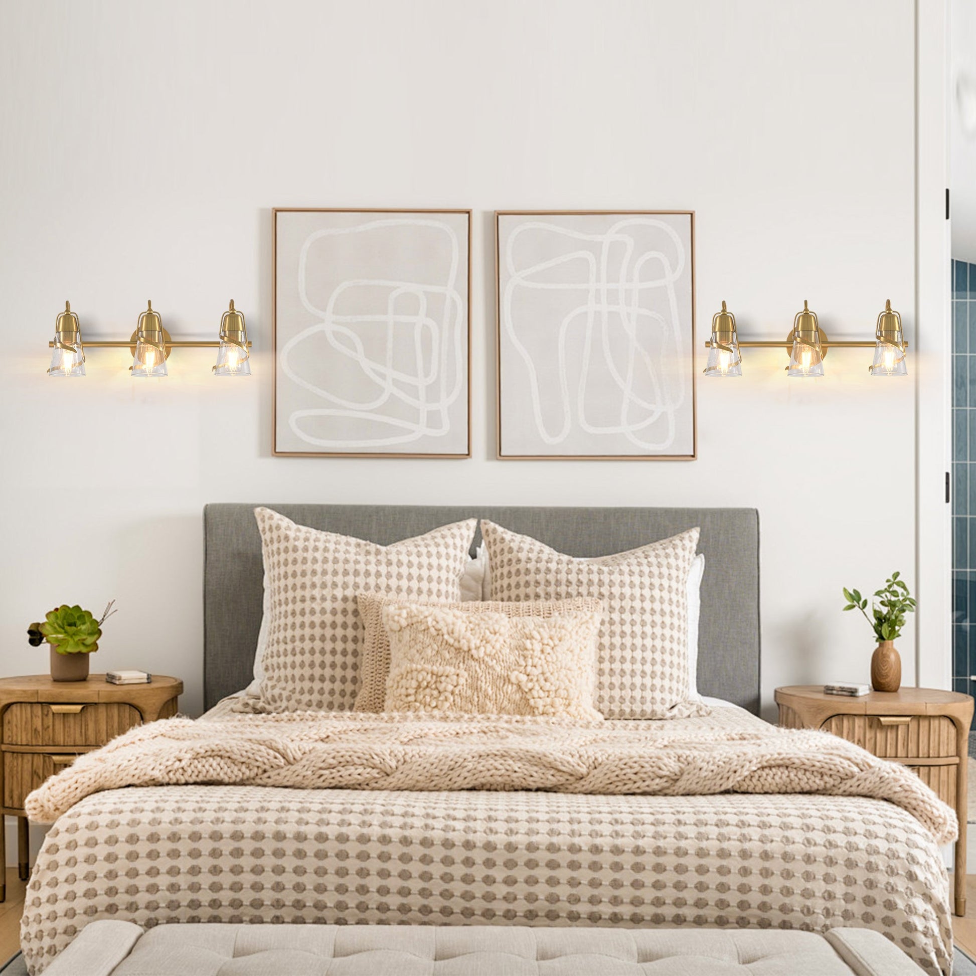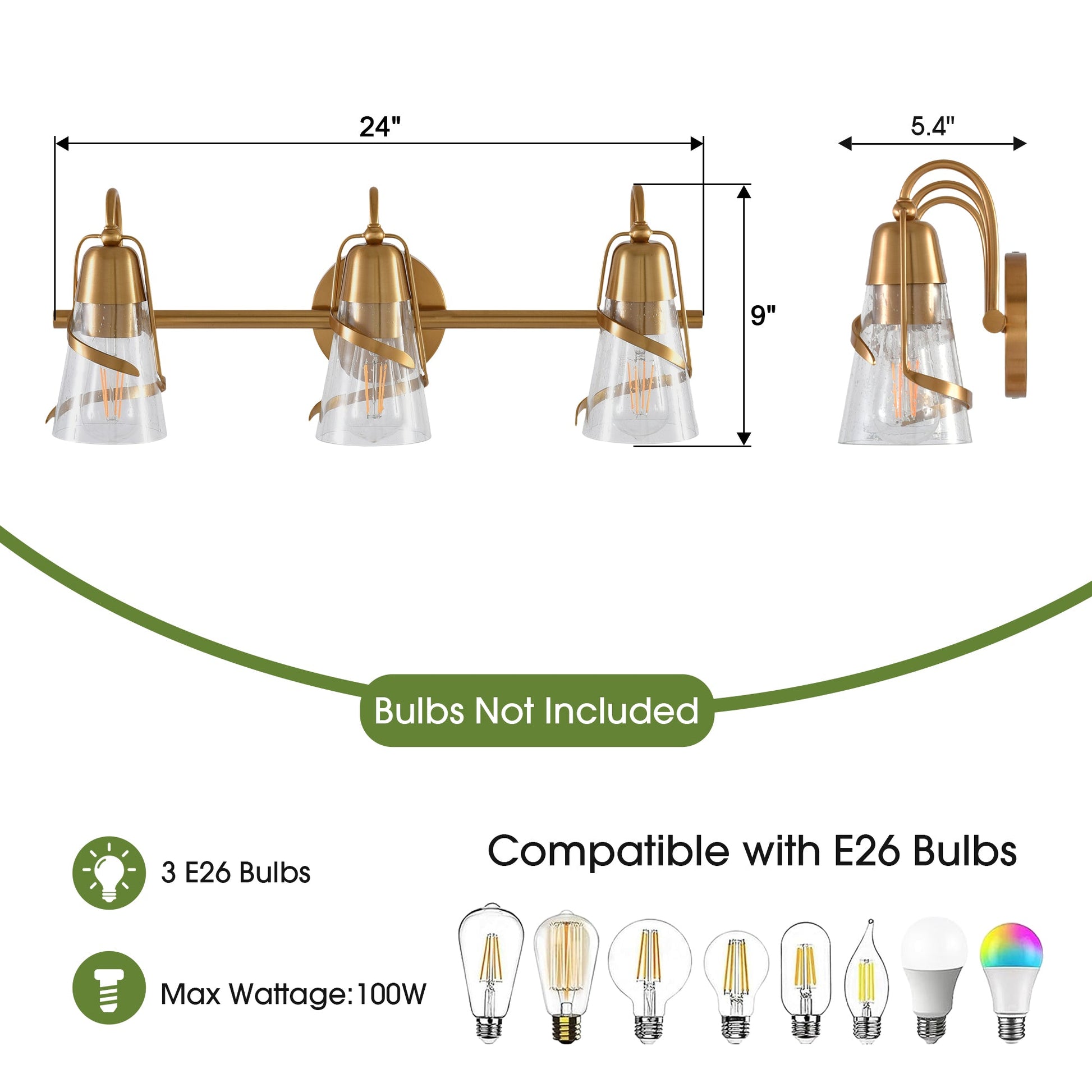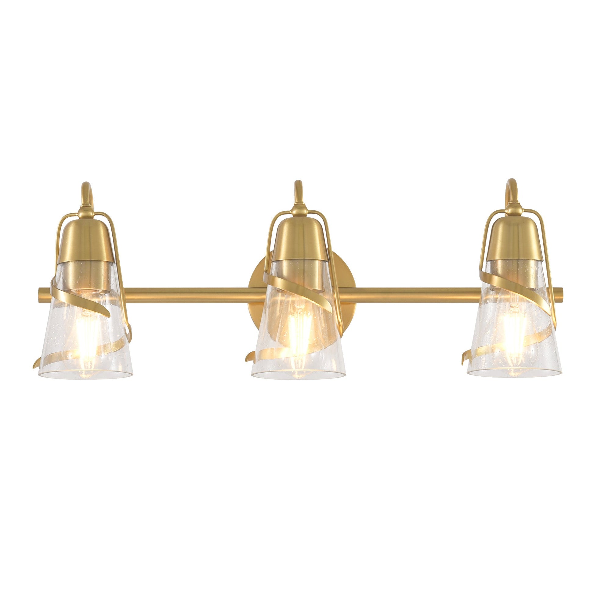 【Modern 3-Light Design】: Features a sleek, modern style with a warm golden finish and glass shades, providing balanced, elegant illumination for vanities or accent walls.
