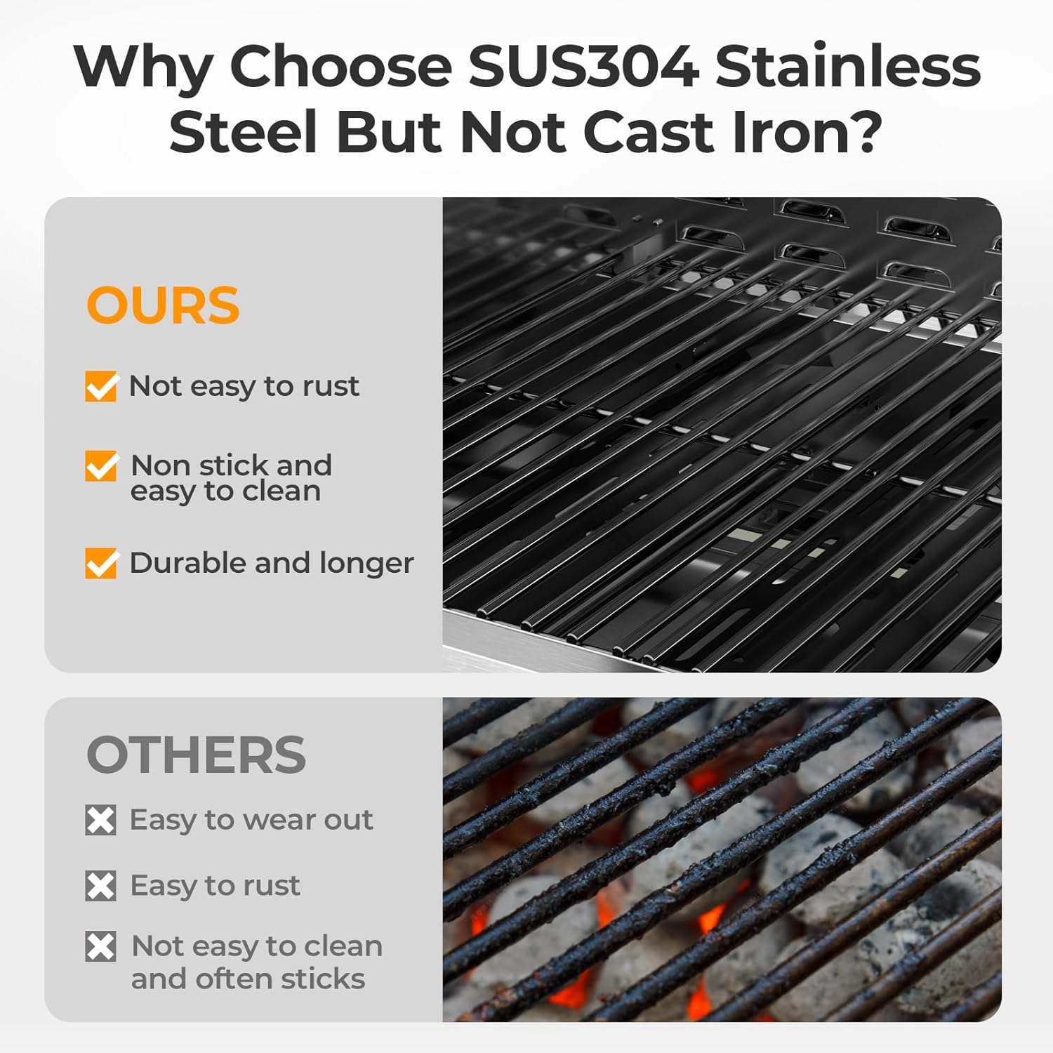 - Last-Long BBQ Grill: Experience the ultimate in outdoor grilling with our Premium Full Stainless Steel Grill. The main structure is crafted from food-grade 304 stainless steel – widely recognized as the industry's gold standard for corrosion resistance. Unlike inferior grills that use cheap 430 stainless steel or galvanized metals, our heavy-duty gas grill delivers a lifespan 1.5 to 7.5 times longer.