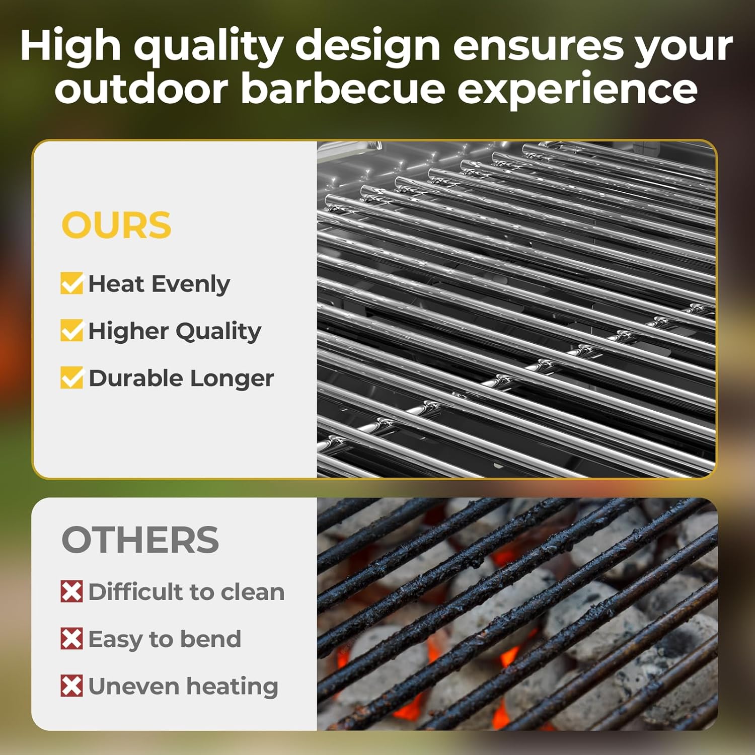 - 【Porcelain-Coated Cast Iron Grates】The cooking grates are made of durable and easy-to-clean porcelain-coated cast iron material, helping prevent rusting and cracking. The stainless steel burners, porcelain-coated cast iron grates, and porcelain flame tamers work together to distribute heat evenly across the grilling surface.