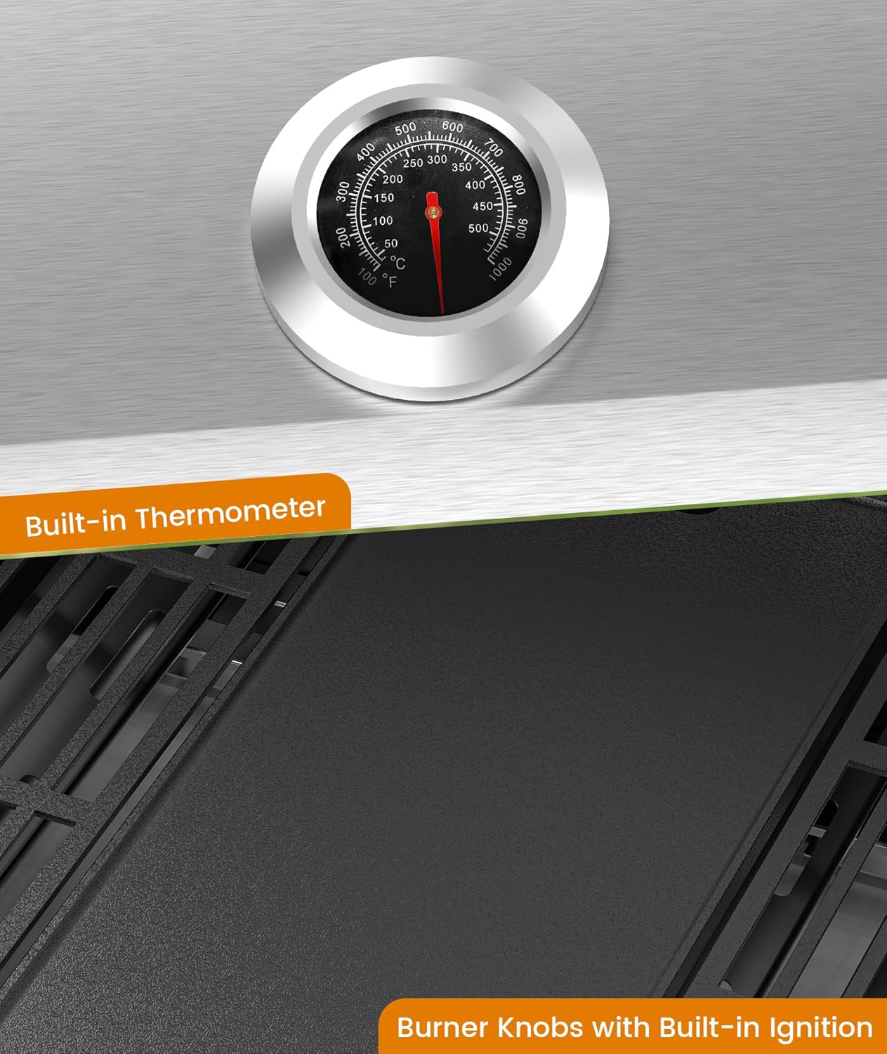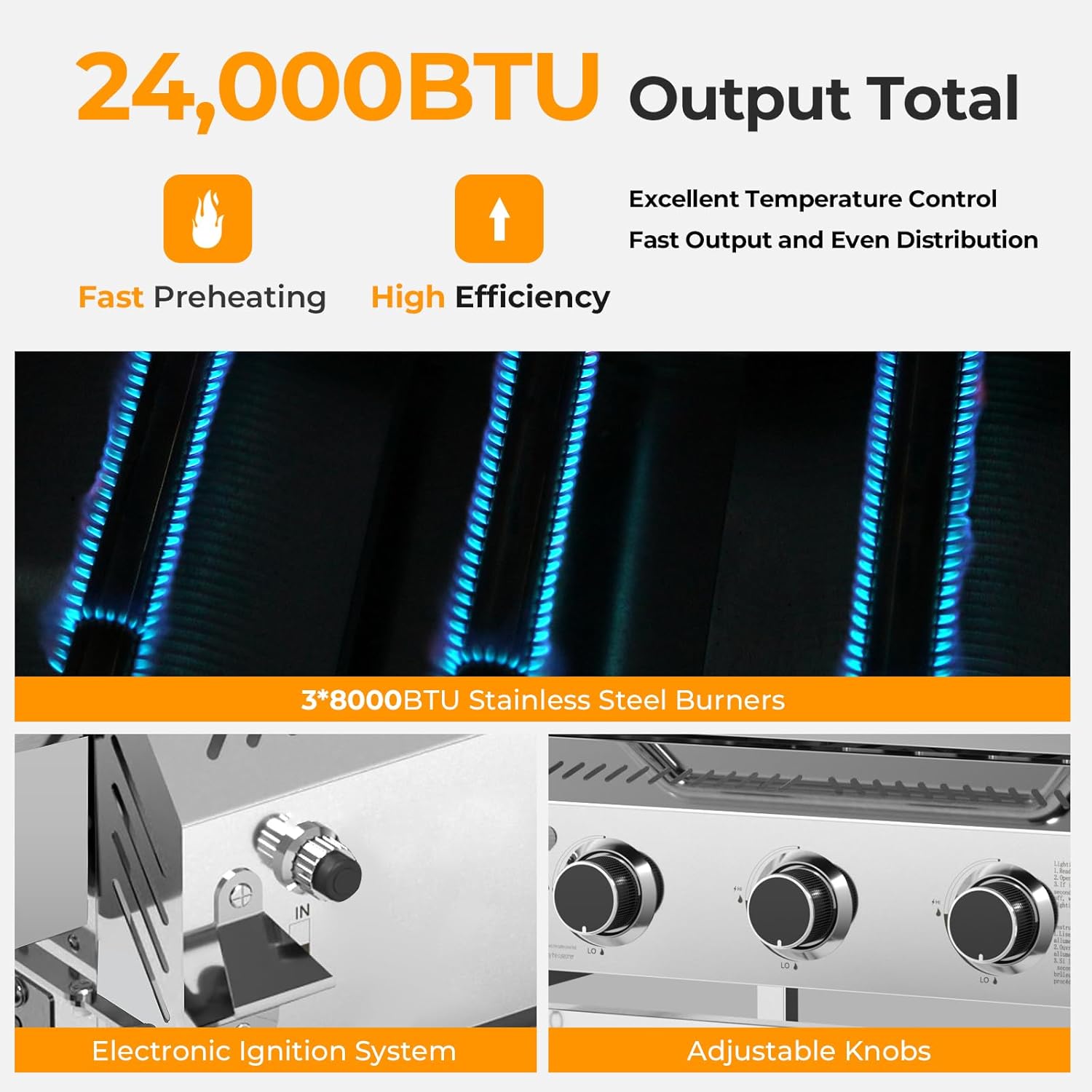 - Quick and Even Heating: 3 x 8000BTU main burners deliver 24,000BTU total power for blistering 3mins heat-up to searing temperatures. The 304 stainless steel grates ensure even heat distribution and non-stick performance. 3 precision control knobs and a lid-mounted thermometer take the guesswork out of grilling. Even beginners can become a BBQ expert in minutes.