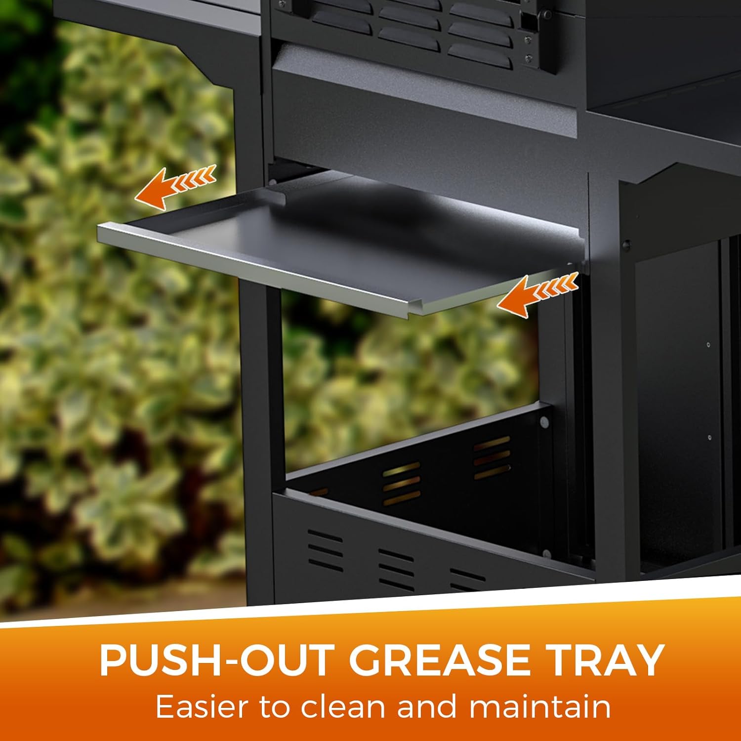 - Easy to Clean: Cleanup is a breeze with 304 stainless steel grate. The pull-out grease tray make it easy to catch and discard drips and splatters. You can enjoy the BBQ without worrying about the mess.