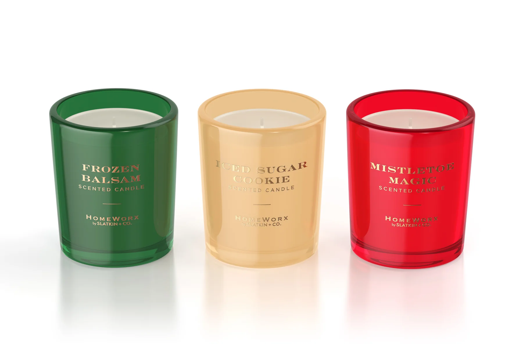 HomeWorx by Slatkin & Co Holiday 3 3.5 oz Candle Gift Set 1-wick Candle Three 3.5 -oz candles One wick Magic Mistletoe, Frozen Balsam, Iced Sugar Cookie Gift Box For the initial burn, simply allow the lighted flame to burn the excess wick to the perfect height. Our self-trimming wicks guarantee an even burn each time. No need to trim the wicks, unless it is a personal preference. Candle Care: Burn within sight. Keep away from things that can catch fire. Keep out of the reach of children and pets. Container may be hot when the candle is lit. Keep all objects such as matches and wick trimmings clean from wax. Do not burn candle for more than 3-4 hours at a time.
