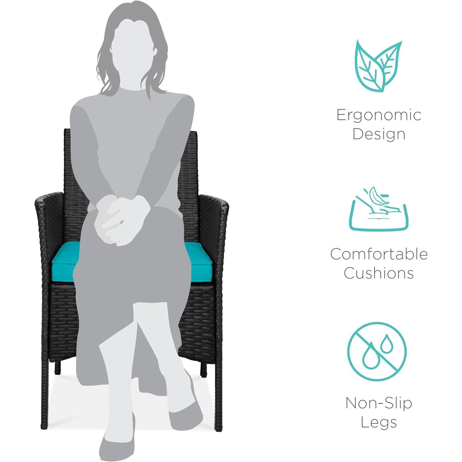 - 3-Piece Black PE Wicker Outdoor Dining Patio Furniture Set w/ Teal Blue Cushions