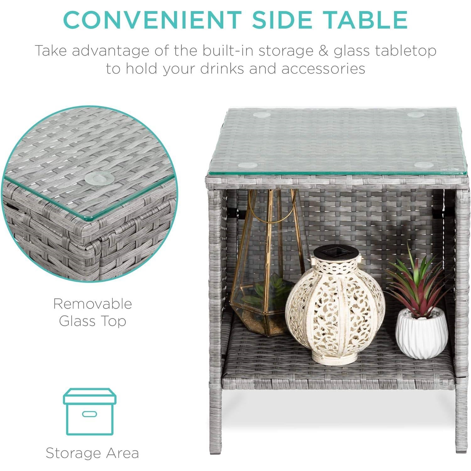 This 3-Piece Grey PE Wicker Outdoor Patio Furniture Dining Set w/ Navy Blue Cushions is a space-saving set of chairs with a matching accent table transform your patio, porch, or balcony into a charming bistro or chic lounge. Both chairs combine a wide backrest with high armrests for added comfort and support, while non-slip feet add stability. A 17-inch table features a storage compartment for your drinks, magazines, or other accessories, while a removable glass tabletop ensures easy cleanup. A set of sufficiently padded cushions feature removable, spot washable covers for easy maintenance. All-weather wicker on a durable steel frame guarantees long-lasting, high-quality seating; CHAIR DIMENSIONS: 23"(L) x 21.75"(W) x 32.25"(H); TABLE DIMENSIONS: 15.5"(L) x 15.5"(W) x 17.75"(H); Chair Weight Capacity: 250 lbs.; Table Weight Capacity: 50 lbs.