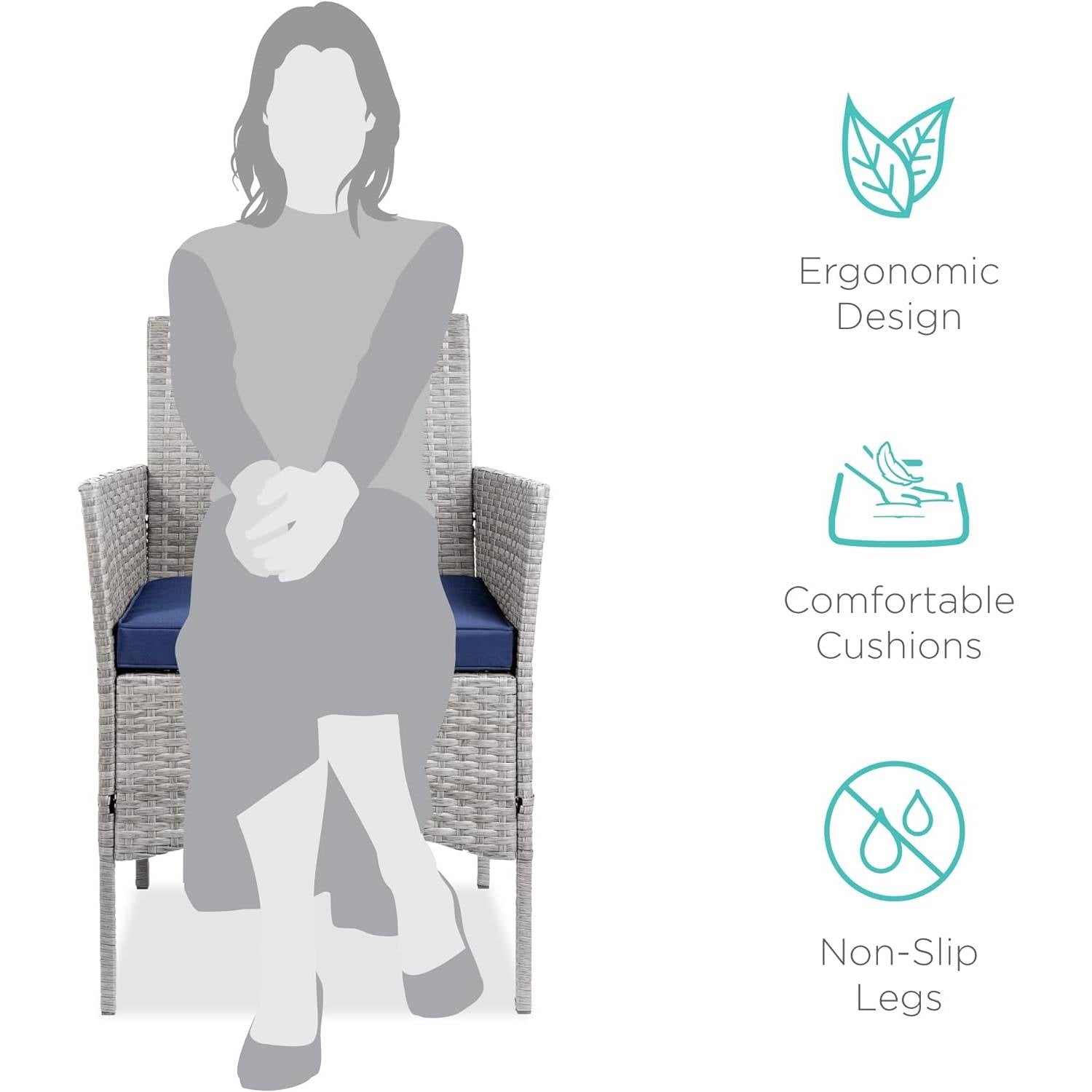 This 3-Piece Grey PE Wicker Outdoor Patio Furniture Dining Set with Black Cushions is a space-saving set of chairs with a matching accent table transform your patio, porch, or balcony into a charming bistro or chic lounge. Both chairs combine a wide backrest with high armrests for added comfort and support, while non-slip feet add stability. A 17-inch table features a storage compartment for your drinks, magazines, or other accessories, while a removable glass tabletop ensures easy cleanup. A set of sufficiently padded cushions feature removable, spot washable covers for easy maintenance. All-weather wicker on a durable steel frame guarantees long-lasting, high-quality seating; CHAIR DIMENSIONS: 23"(L) x 21.75"(W) x 32.25"(H); TABLE DIMENSIONS: 15.5"(L) x 15.5"(W) x 17.75"(H); Chair Weight Capacity: 250 lbs.; Table Weight Capacity: 50 lbs.
