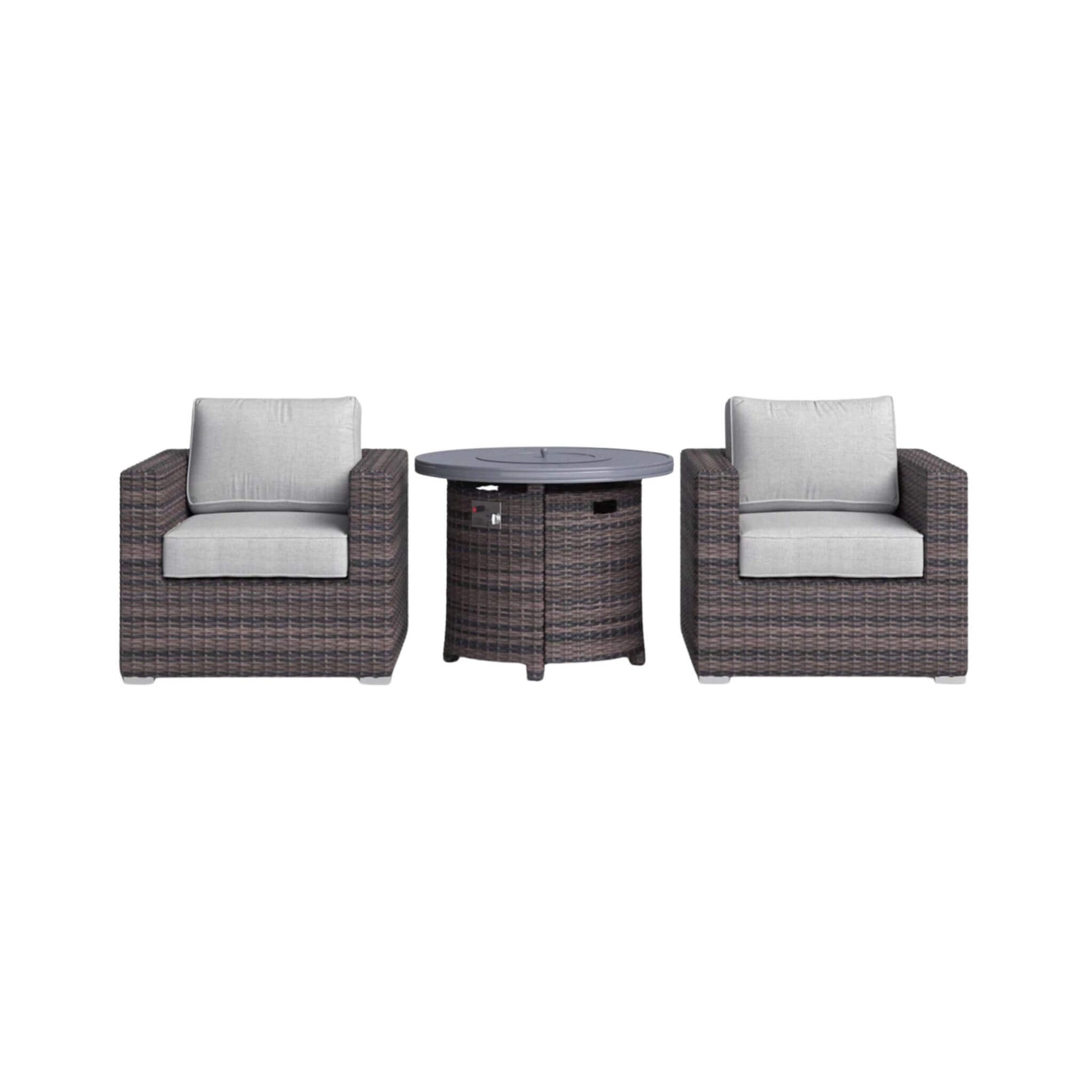 - Whether you're entertaining or unwinding, this set creates a stunning ambiance with sleek woven textures and a glowing fire pit centerpiece.