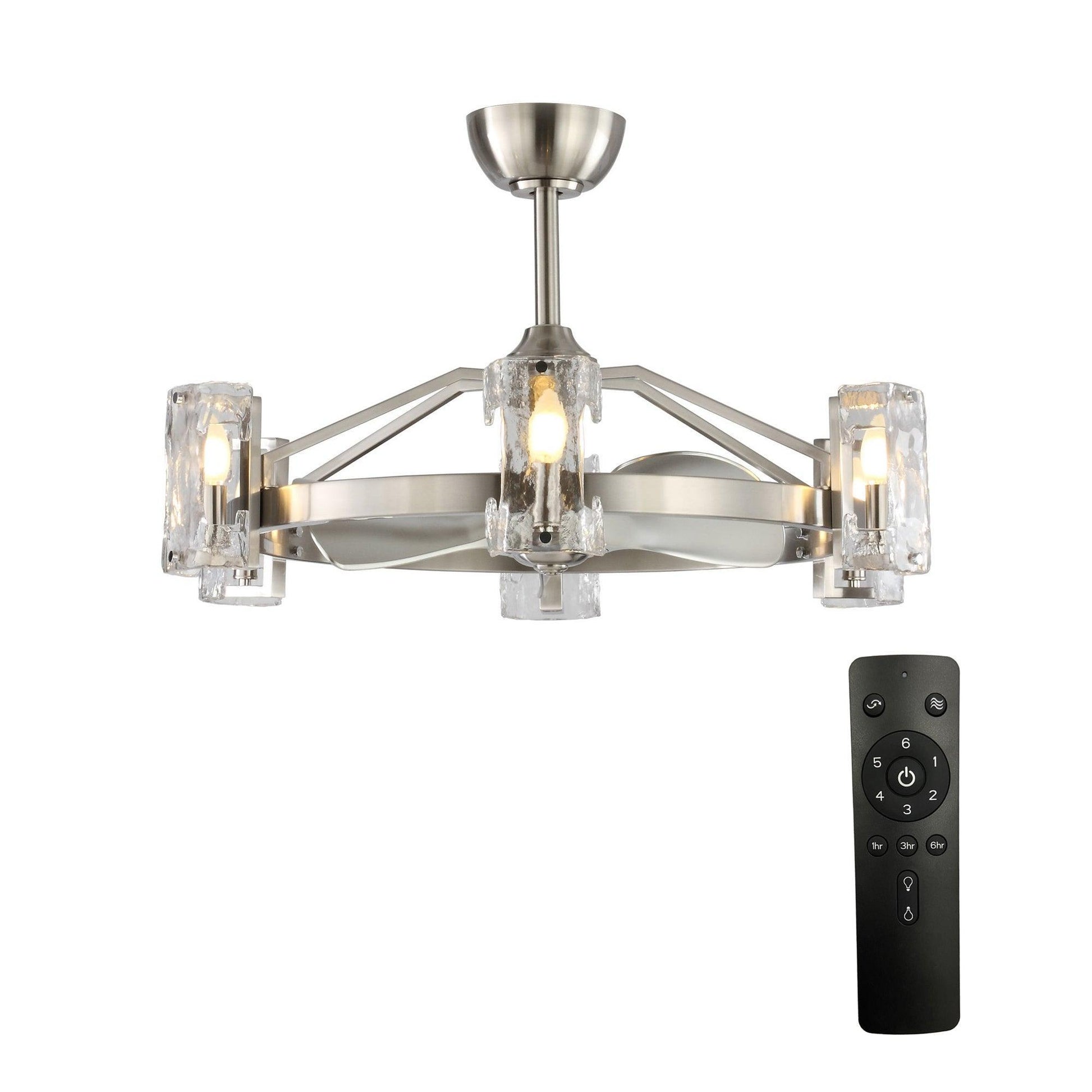 This decorative and functional chandelier ceiling fan Fandelier 3 blades ceiling fan with a light and remote. Reversible blades. 6 fan speed gives off a great airflow, required 6-piece 4-Watt light bulbs. The timing function, allows you are able to choose the working time. With its delicate hand-craft and glamorous appearance, this Satin Nickel 3 Blade Ceiling Fan with Remote is surely a statement piece for your kitchen, dining room, living room, bedroom, or foyer.