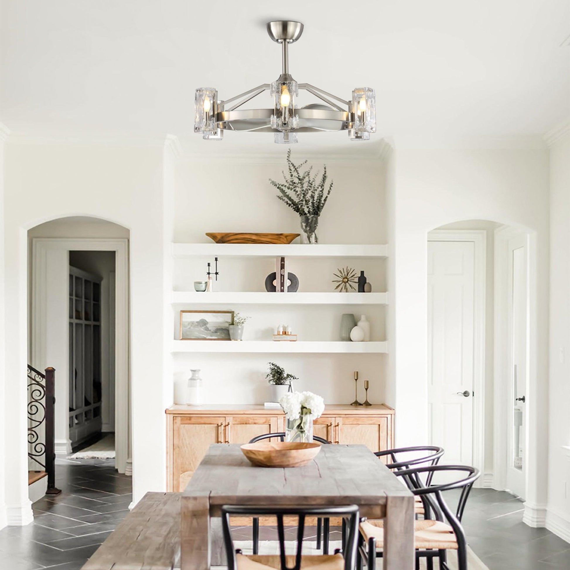 | 34” | Iron, Glass | D1"-L8"&L20 | 3*ABS Blades | 6*E12 Lamp holders no bulbs | DC motor | Remote control | 6 | Dry location |
