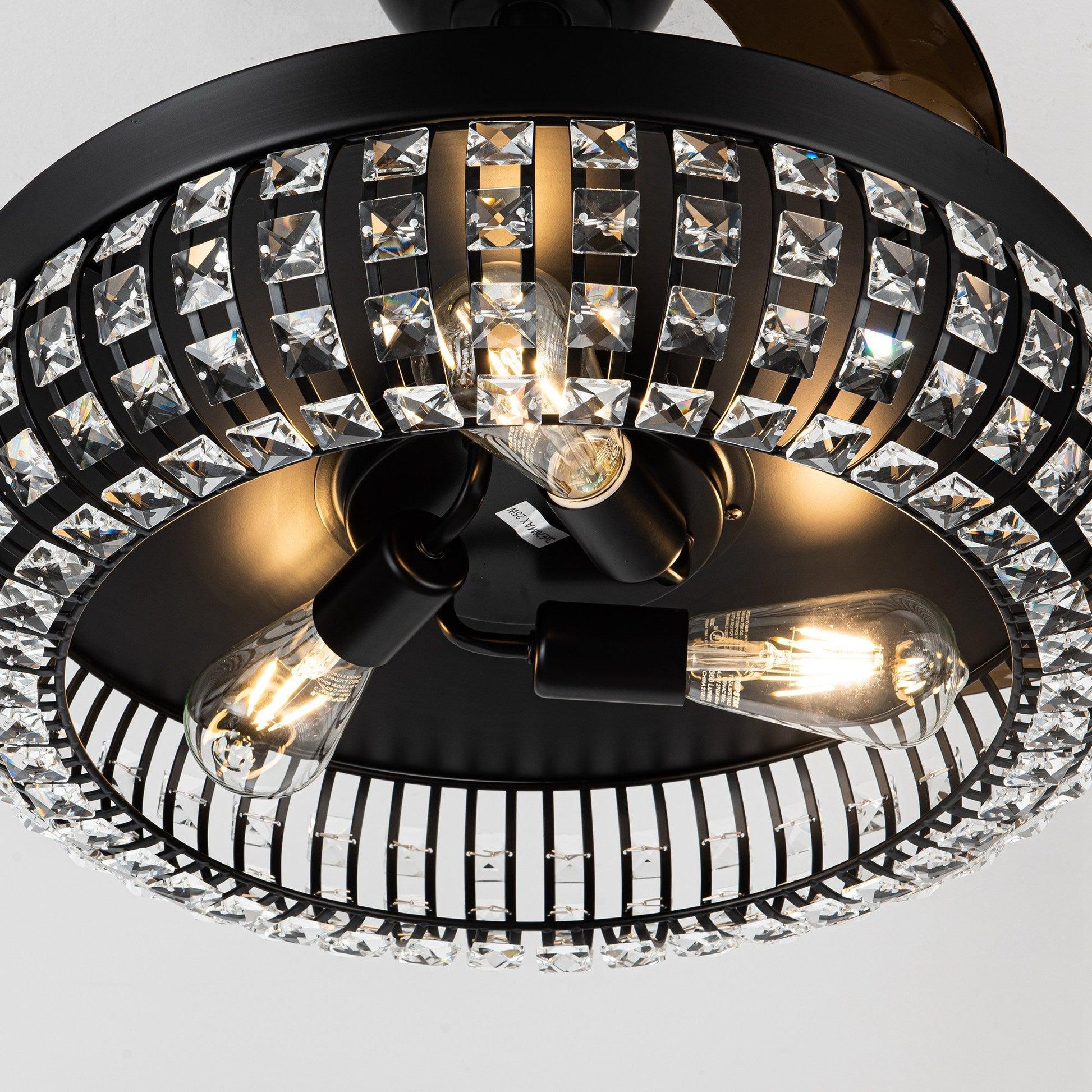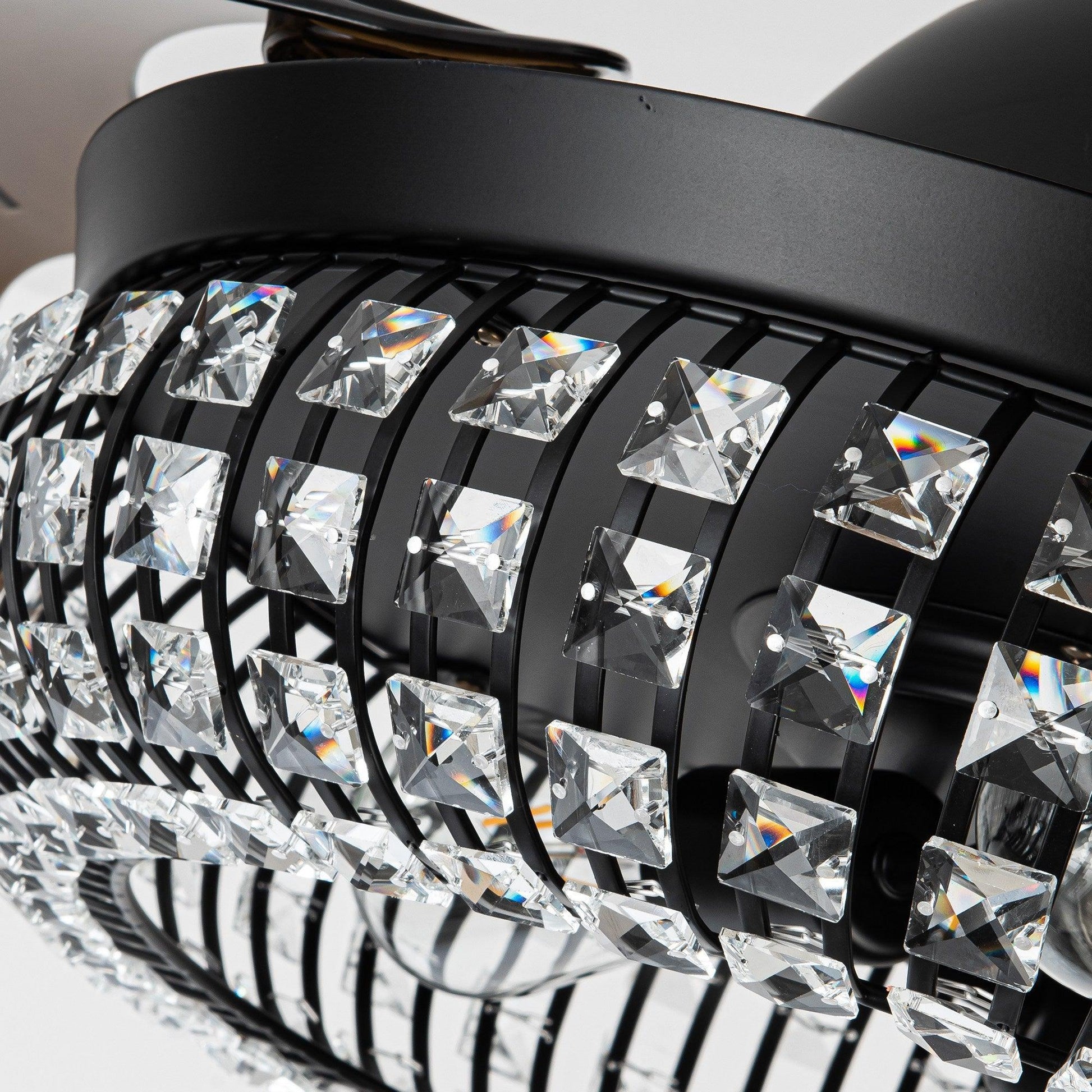 Illuminate your room in style with this crystal ceiling fan. Function meets fashion in this radiant and chic 42-inch retractable chandelier ceiling fan. This fan boasts three LED lights for wonderful illumination surrounded by artful and elegant crystal-embedded shade for a delightfully distinctive look. Three dark brown blades allow for maximum air movement! This matte black ceiling fan adds the perfect touch of glamour to your home while also keeping air circulating with multi-speed functions. The handy remote control provides independent light operation and speed control. The motor technology delivers powerful air movement with whisper-quiet performance.