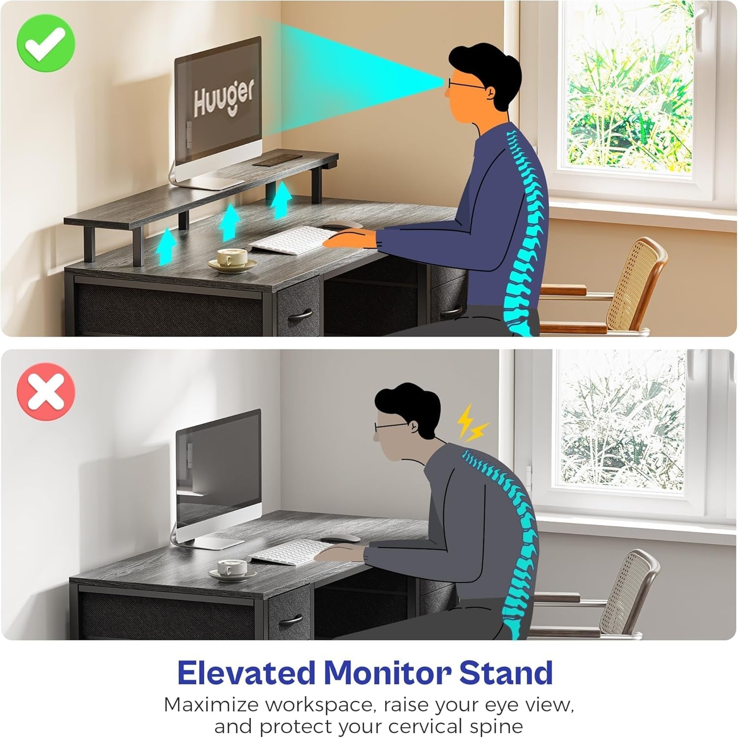 - Ergonomic monitor stand lifts your screen to eye level to reduce neck strain and support a healthy workstation posture.