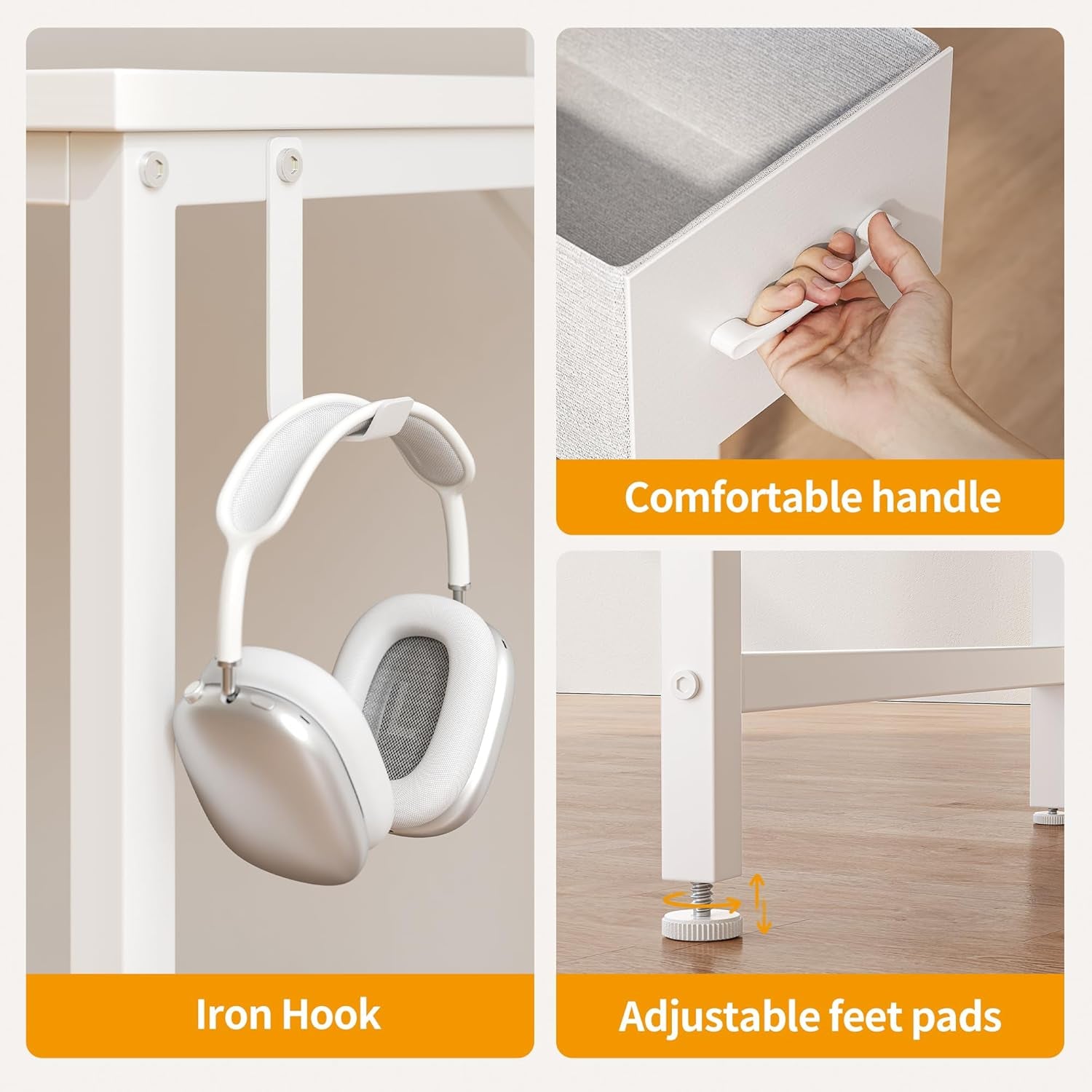 - Smart extras: 2-tier drawers, a heavy-duty iron hook for bags or headphones, and adjustable feet to prevent scratches.