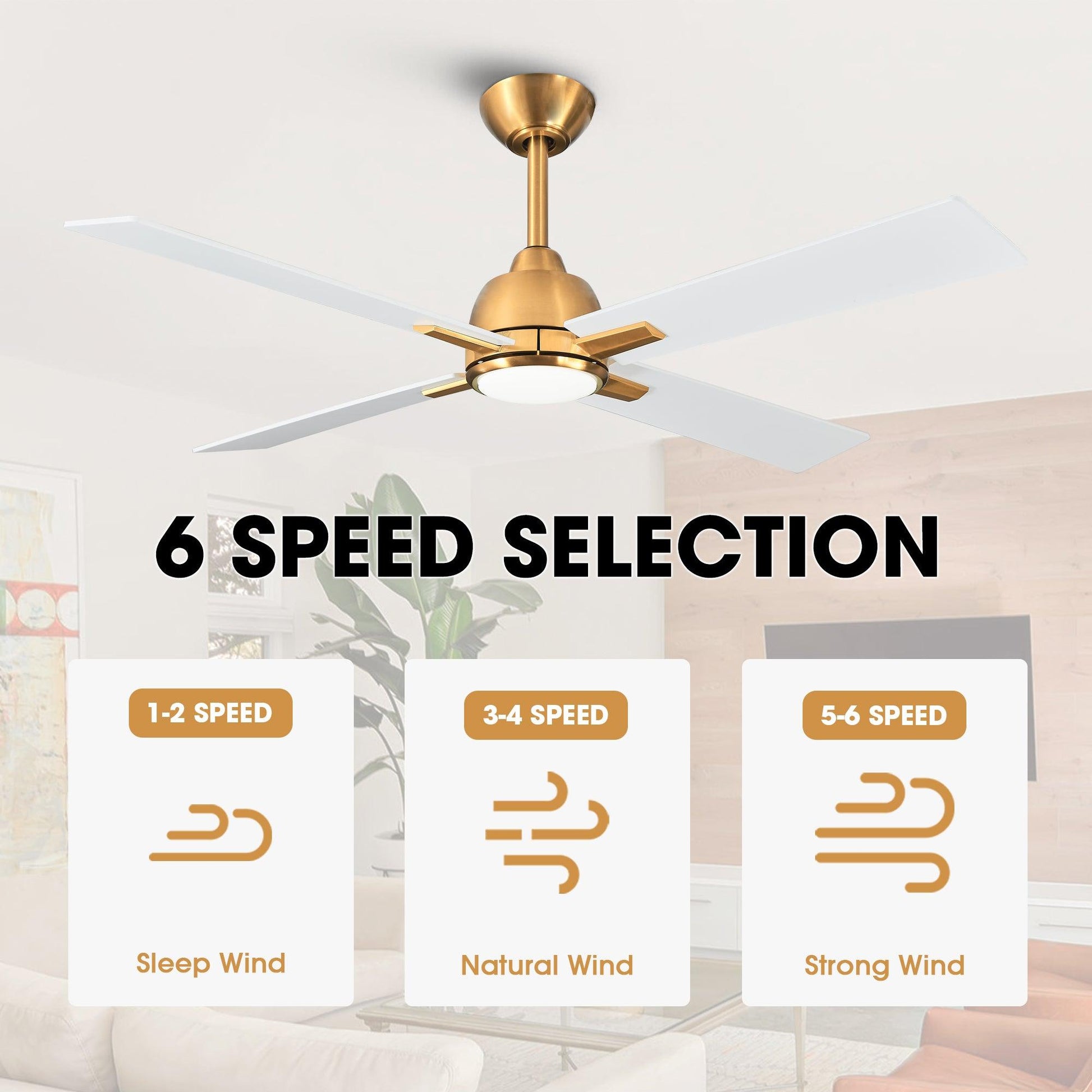 When looking for reliable performance and value, the 48-inch Linden modern ceiling fan is the best choice. The ceiling fan bodies are golden and satin nickel, and matched with matte white fan blades, which is more refined, and the simple lines perfectly match industrial and modern/casual environments. It comes with the option of LED light kit (bulb included). Designed with 6-speed DC motor and controlled by remote control. The light kit is available in 3000/6500K color temperatures. Suitable for use in medium spaces.