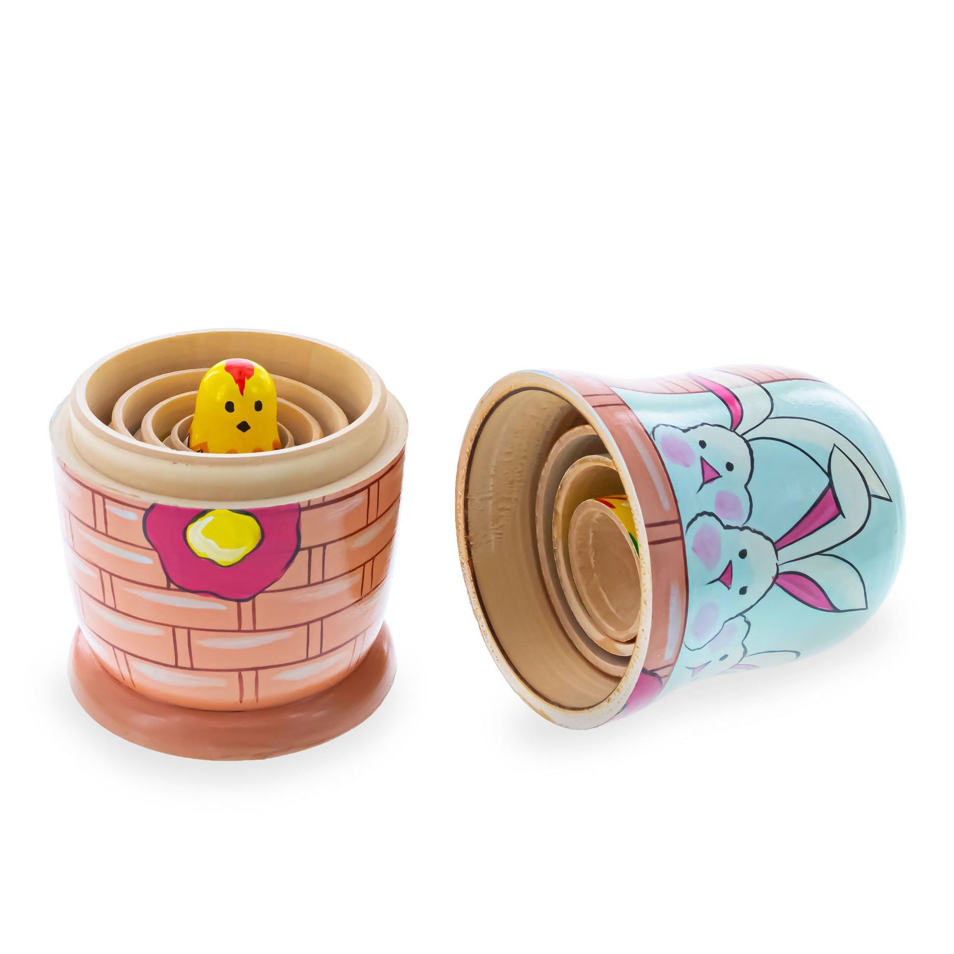 5 Bunnies, Chick with Easter Eggs Wicker Basket Wooden Nesting Dolls 6 Inches