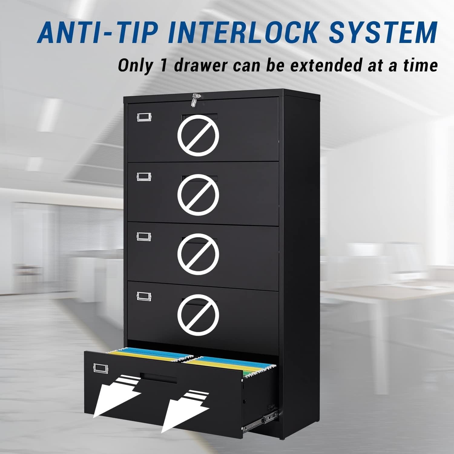 Maximize your productivity with a secure, space-saving 5-drawer lateral file cabinet designed for busy home offices. This sturdy metal filing cabinet keeps documents neatly organized, protects sensitive papers behind lockable doors, and accommodates Letter, Legal, A4, and F4 sizes in a single, accessible unit.