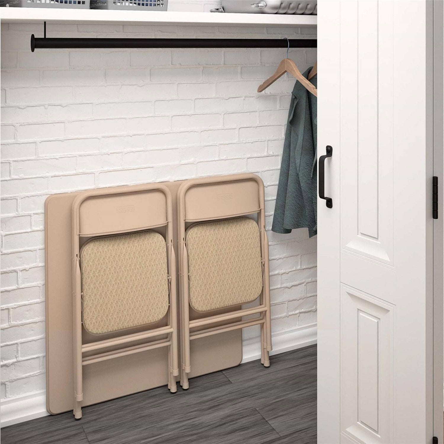 Trusted solution for multipurpose indoor/outdoor dining. Great for holiday gatherings, parties, tailgating, or everyday use. Entertain with ease with this 5-Piece Square Folding Dining Table Guest Dinning Set - Beige! The solution for quickly preparing a comfortable seating arrangement for 4. The set will enhance any atmosphere ranging from family gatherings, parties, or tailgates. Comfortable for entertaining and compact for storage, this set features durable steel frame and a powder-coated finish. This set comes with a sturdy 34" square card table with low maintenance and easy to clean vinyl table top. The cross braces and tube-in-tube reinforced frame of the table to enjoy for years! The 4 chairs, built for maximum comfort and durability, are upholstered in an attractive fabric with padding on the seat and back to relax in style. The tables and chairs are made of a sturdy steel frame and rubber tips to protect your floors. When not in use, the set folds compact for easy storage. The card table has an easy-to-clean vinyl table top and standard 34" dimensions. Versatile table with many utilitarian uses. The table has 100 lbs. weight capacity. Chair cross braces on front and back legs with a tube-in-tube reinforced steel frame for strength and stability. 250 lbs. weight capacity. Great for small space living, with dimensions that make the set easy to store. Chair folds to 2.5" D x 34.4" H x 17.3" W. Table folds to 1.4" D x 34" H x 34" W.