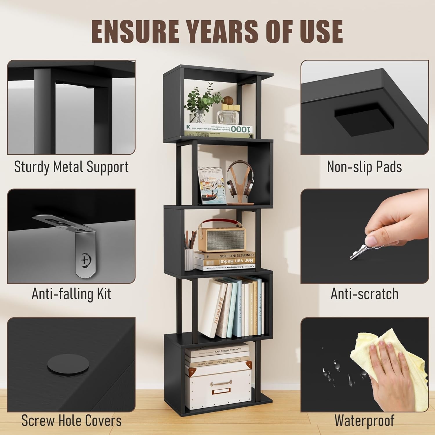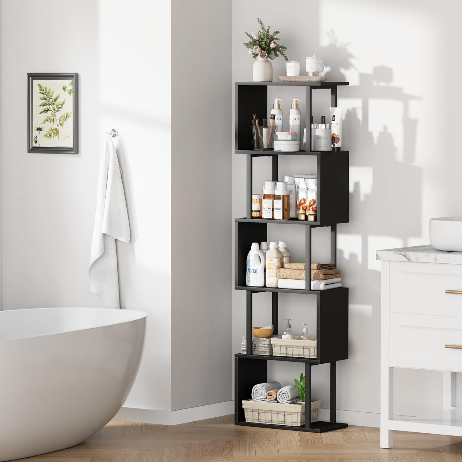 Versatile styling with a sleek black finish helps this 5-tier S-shaped bookcase blend with any decor—from contemporary to minimalist. Place it in your living room, bedroom, or home office to display books, magazines, plants, and keepsakes, creating an organized, inviting space that supports focus and relaxation.