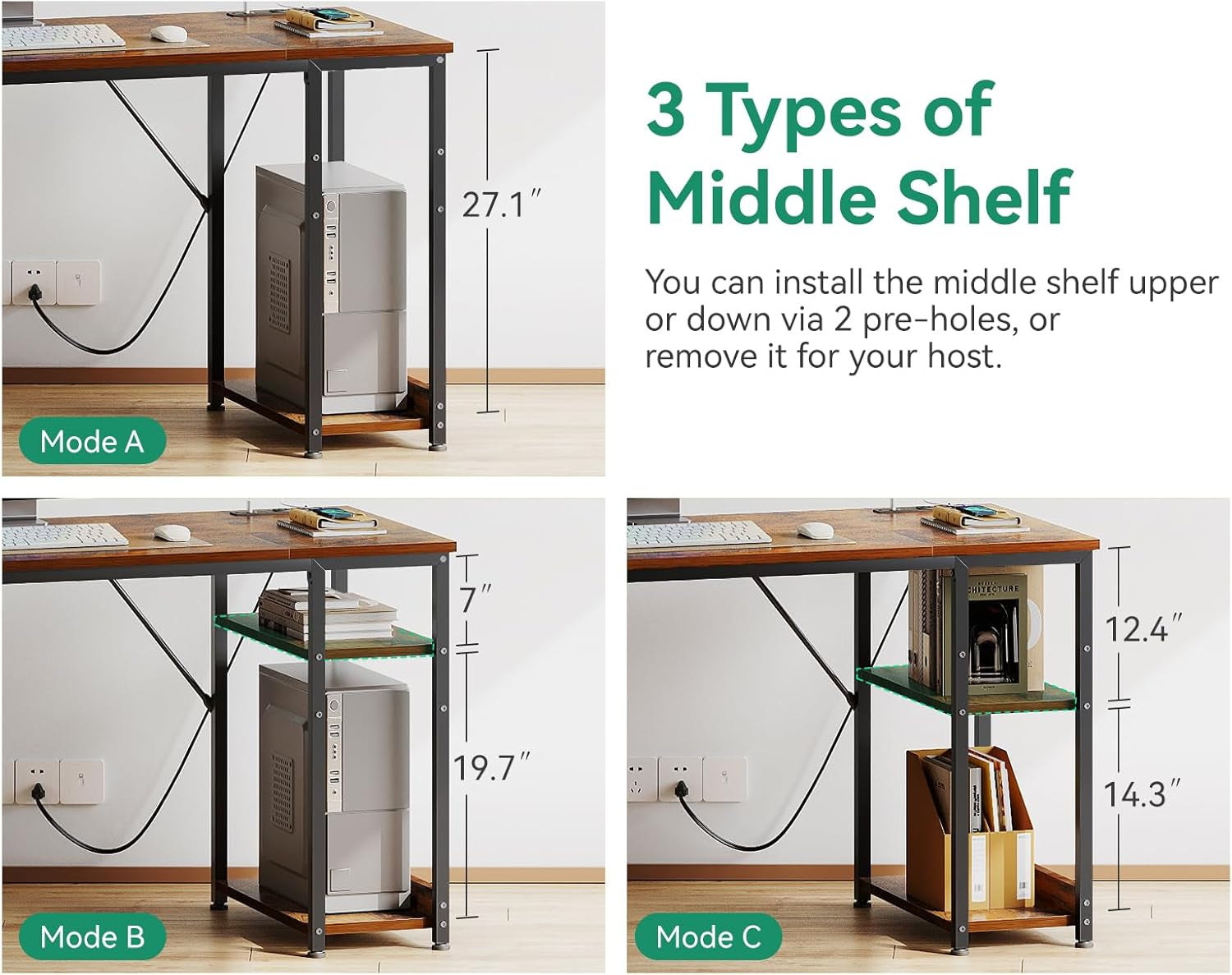 - Double-tier storage shelves: built-in shelves for books, office supplies, and decorative items to reduce clutter on your work surface.