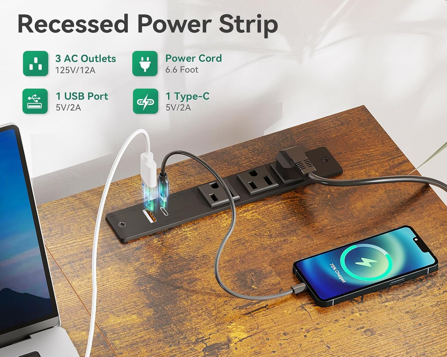 - USB power outlets and charging ports: three power outlets and two USB ports keep laptops, phones, and tablets charged and within easy reach.