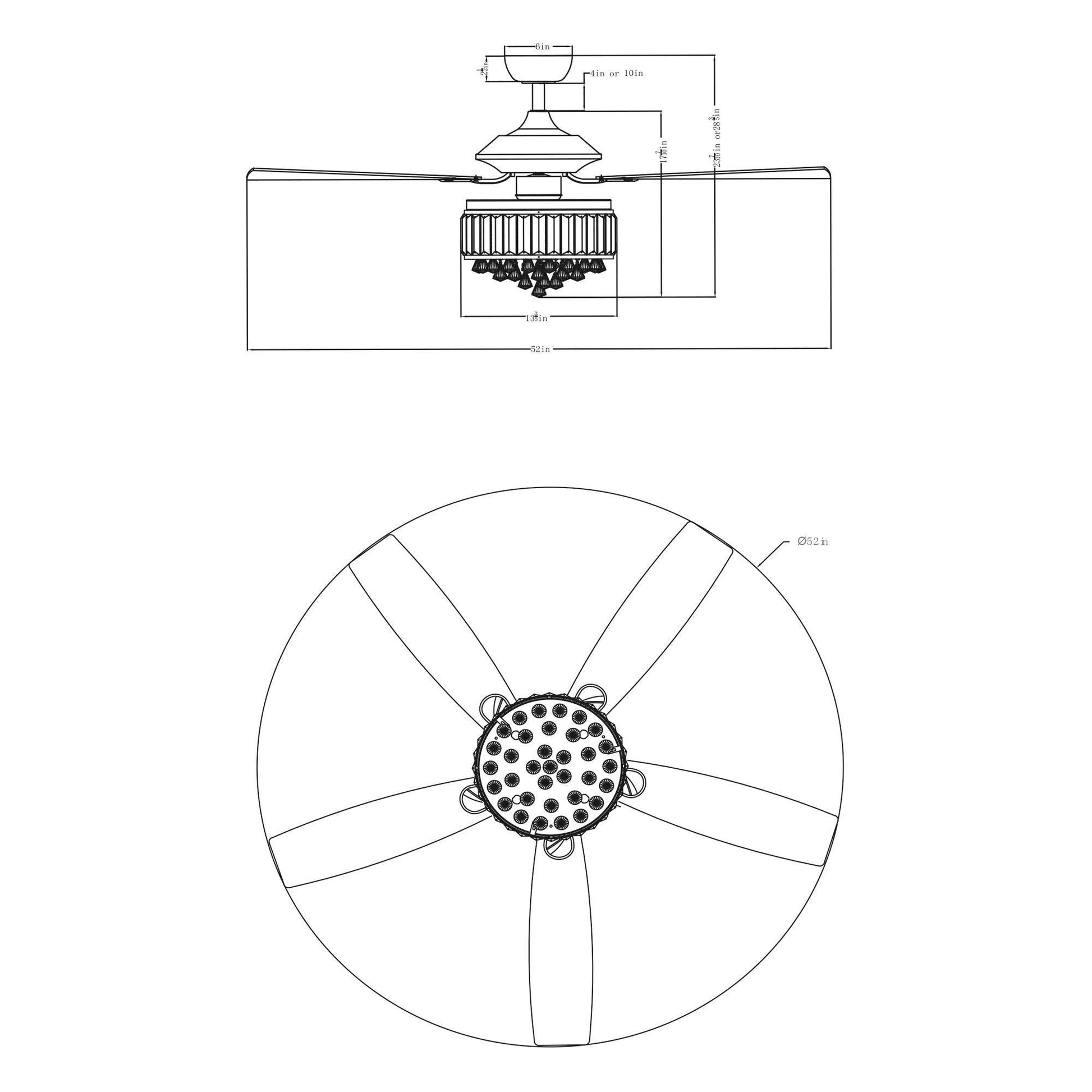 | 52” | Iron, Plywood, Crystal | L4"&L10" | 5*Plywood Blades | 4x25W, E12 base light bulb(not included) | AC motor | Remote control | 3 | Dry location |