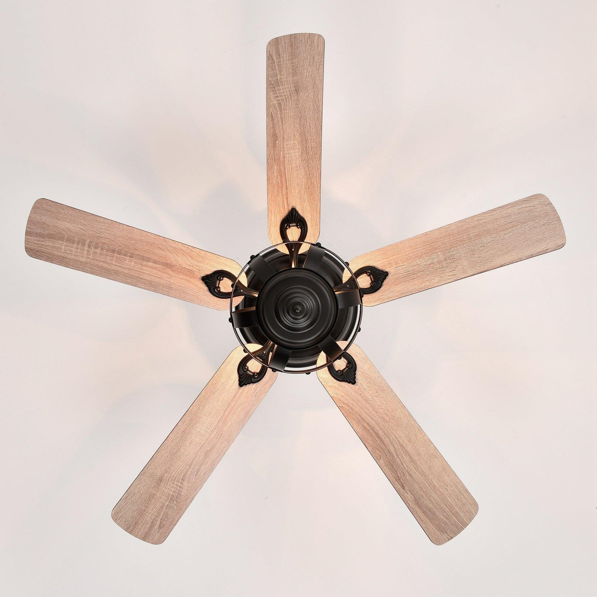 This reversible blade ceiling fan is a great option for keeping a room cool while delivering on-trend style. Featuring 5 manufactured wood blades and a metal base, this piece is a great option for larger rooms thanks to the 52-in-blade span. Below, 3 candle lights with included bulbs allow this piece to keep your space bright as well as cool, while an openwork metal globe shade with rivet details adds an industrial-inspired accent perfect for a modern farmhouse. This piece includes a remote control so you can control the breeze without getting up.