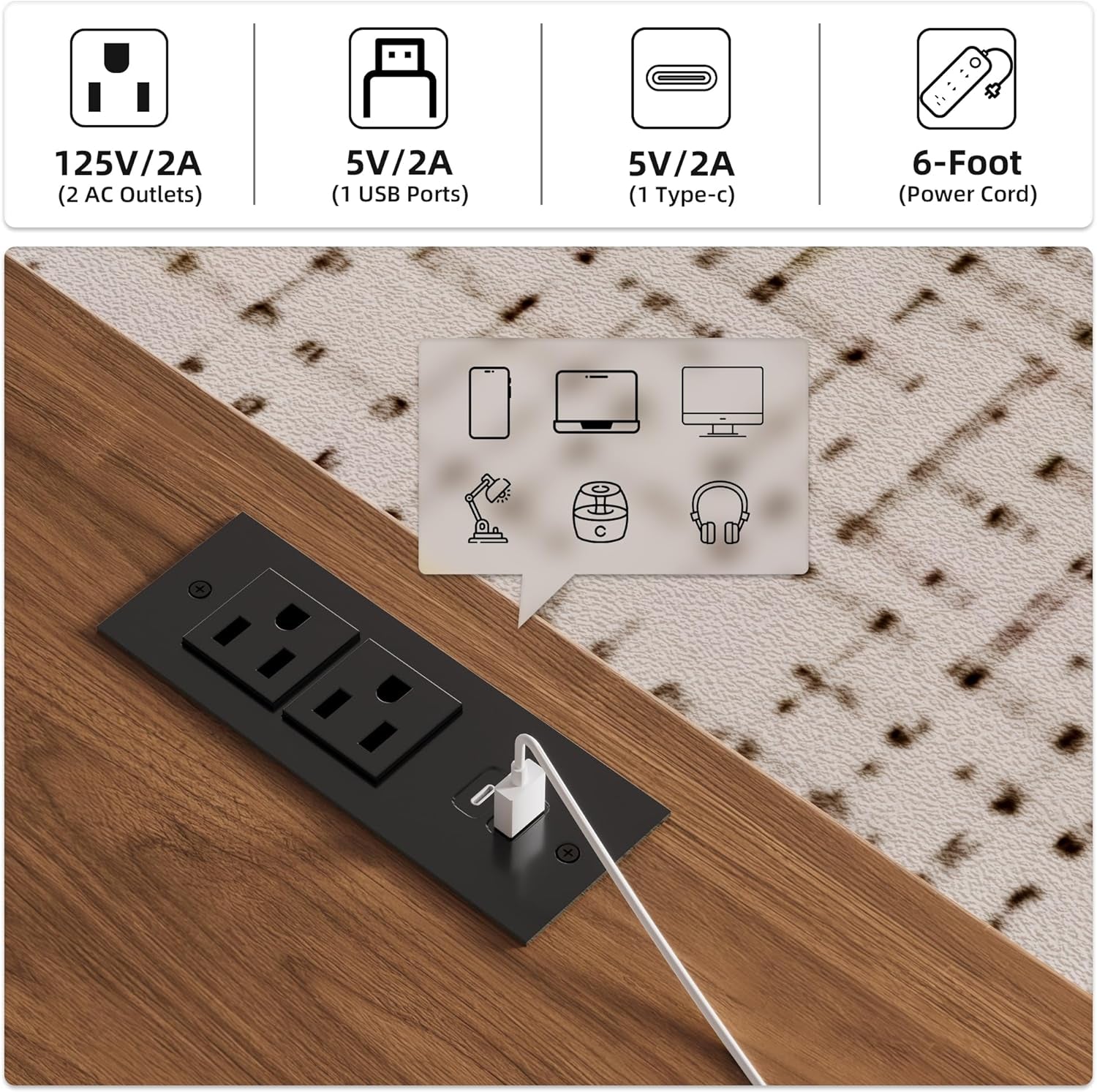 - Built-in charging port: a dedicated charging station with two power outlets, one USB port, and one Type-C port so phones, laptops, and peripherals stay powered without hunting for outlets.