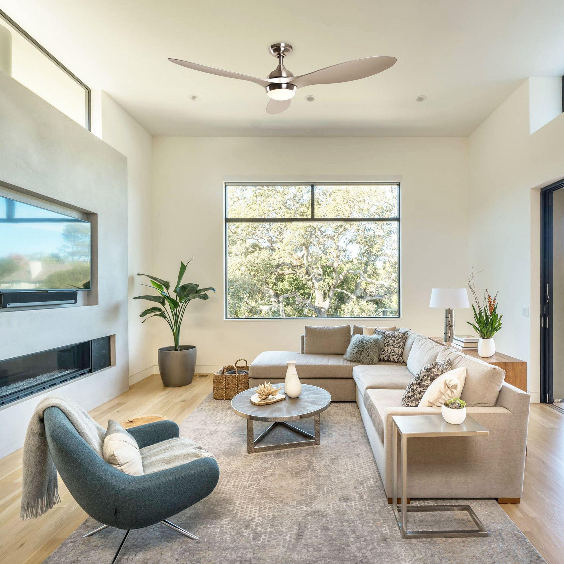 This ceiling fan with Light features a modern design with 3 exceptionally carved all-wood blades at a 12° pitch and a 56 in. span complete with integrated LED light and a DC motor making it the perfect blend of form and functionality. The Industrial 56 in. ceiling fan is durably constructed for industrial, commercial, and residential applications. Perfect for workshops, high-ceiling great rooms, 2-story entryways, and lofts.