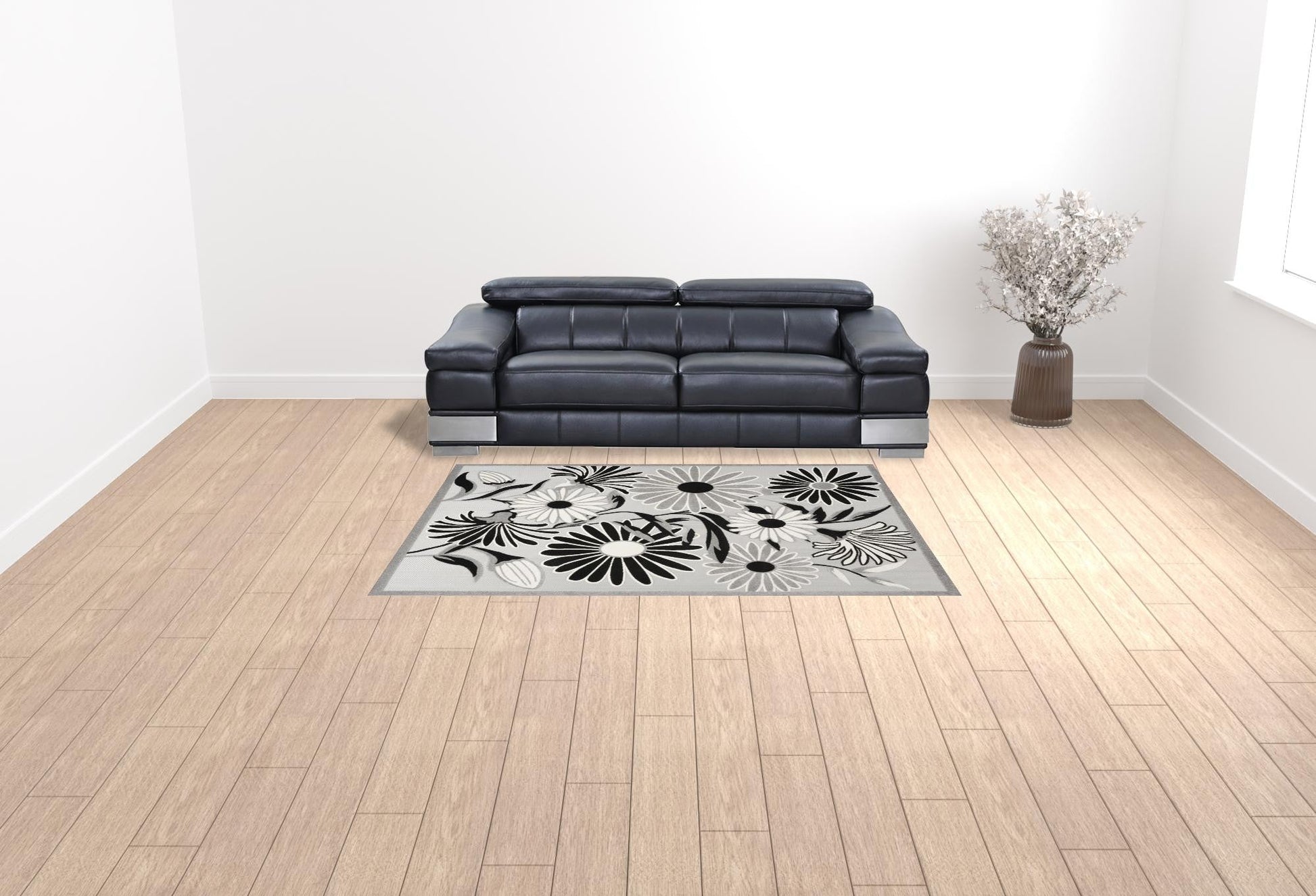 6' X 9' Black And White Floral Stain Resistant Non Skid Area Rug