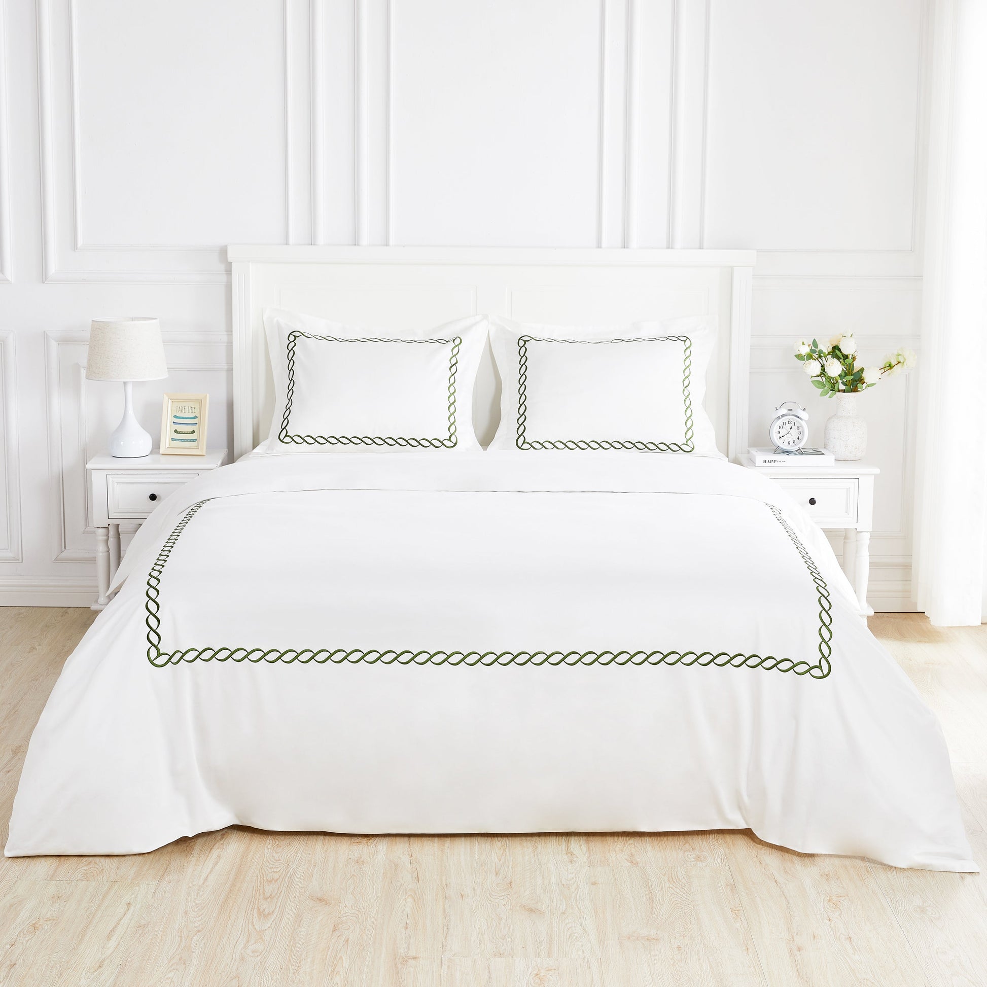 DescriptionOur 600 thread count duvet set is woven with extremely fine yet durable long staple cotton, producing an exceptionally smooth and soft duvet set. We added a thin border rope embroidery for a hint of style. Exceptional quality and elegance, all at a comfortable price. Pairs with 600 Thread Count Rope Embroidered Sheet Set Details