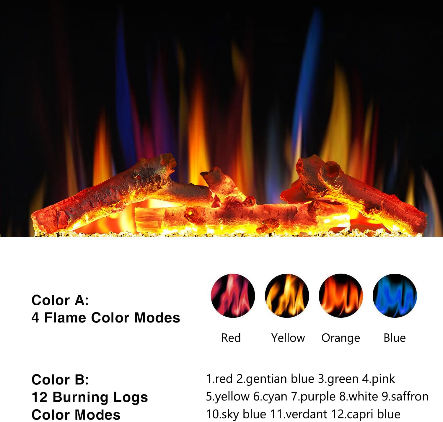 - 【 Function Of Electric Fireplace】 R.W.FLAME Electric Fireplace uses LED lights and adopts 3D flame technology, which has a realistic flame effect, brings a warm and cozy ambiance . 5 levels of flame brightness, 4 flame colors, and 12 fireplace bed colors to meet needs. And random mode create realistic flame ambience with smokeless.