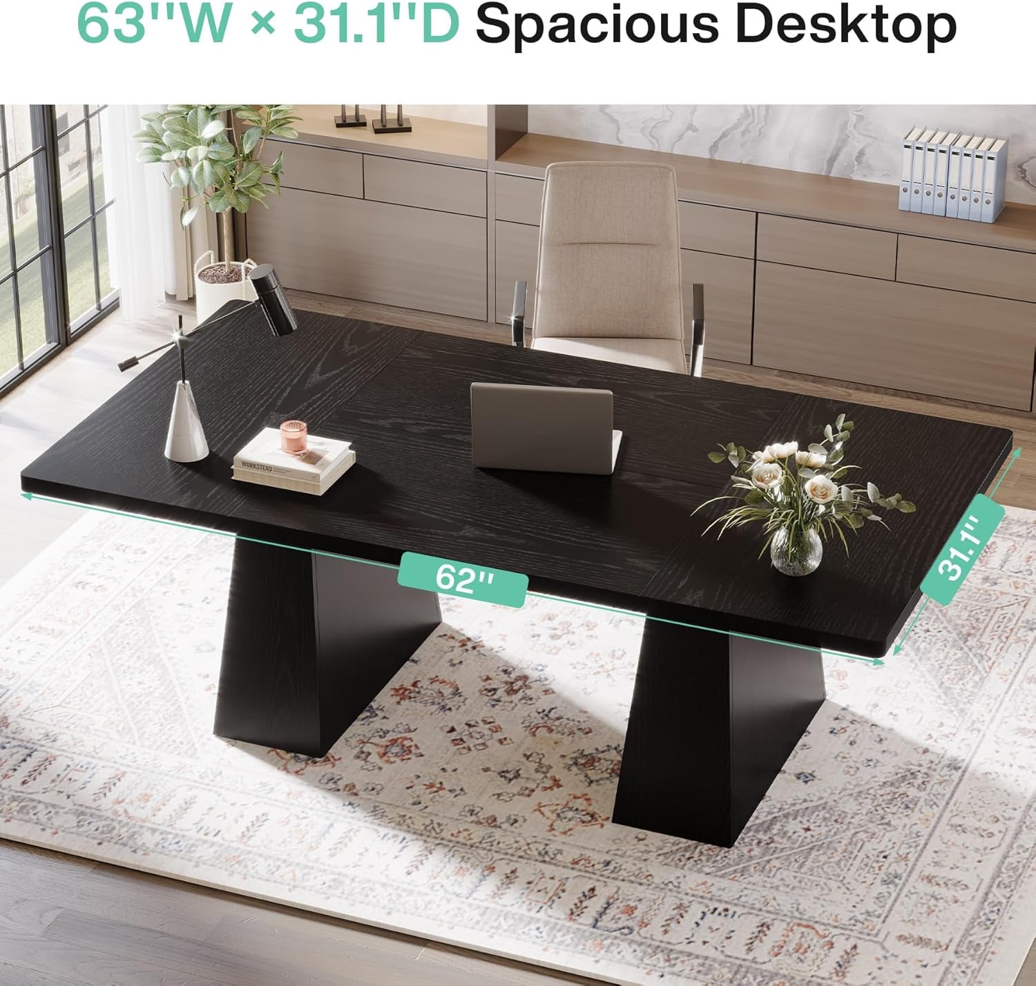 Command attention with a 63-inch modern executive desk that blends bold presence with everyday practicality. In a sleek black wood-grain finish, the desk exudes professional polish, while smooth curved edges add comfort and refinement. The imposing double pedestal base makes a confident statement and keeps your workspace rock-solid.