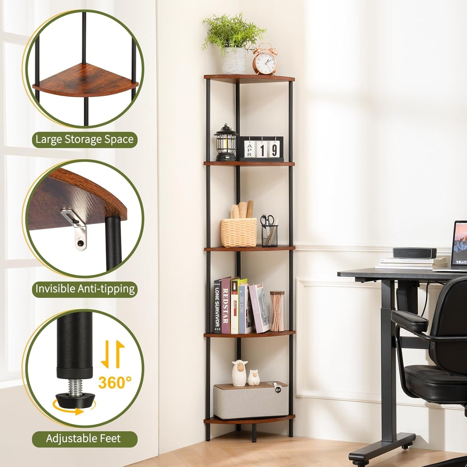 Turn every corner into a stylish display with the 65" Rustic 5-Tier Corner Shelf Stand. This tall, space-saving corner bookshelf brings generous storage to your living room, bedroom, office, or kitchen—while keeping books, plants, speakers, and decor within easy reach.