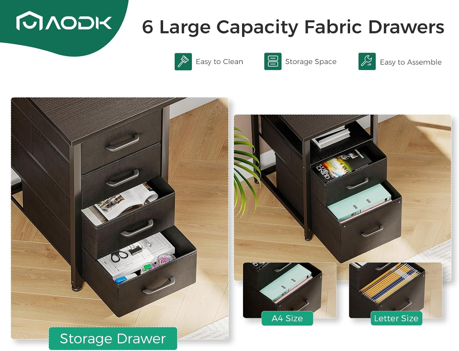 - File cabinet and fabric drawers—two-drawer file cabinet for letters/legal/A4 files plus a 4-tier fabric drawer set for under-desk storage.