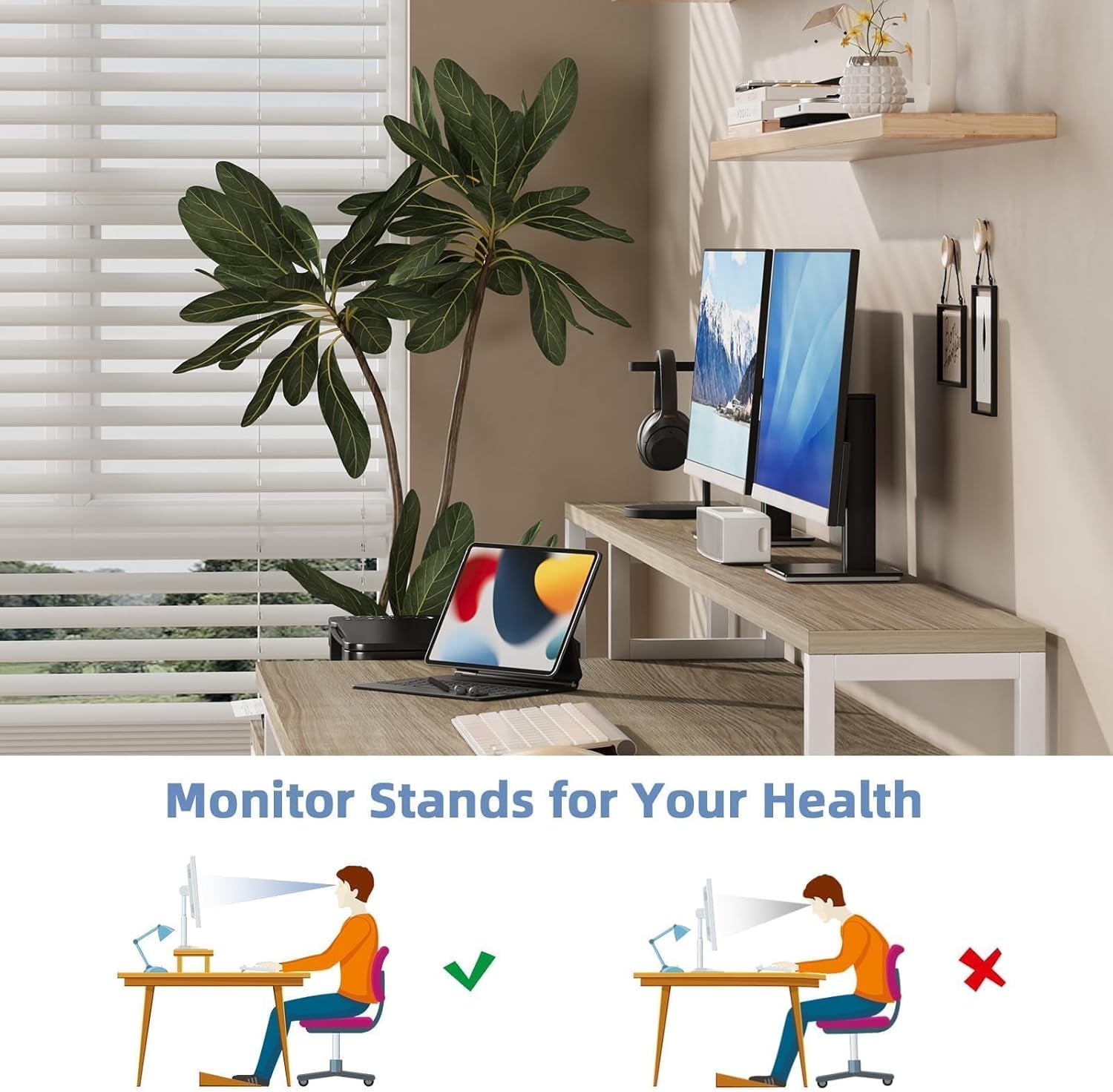 - Pre-set monitor placement spaces help you maintain better posture and an efficient workflow.