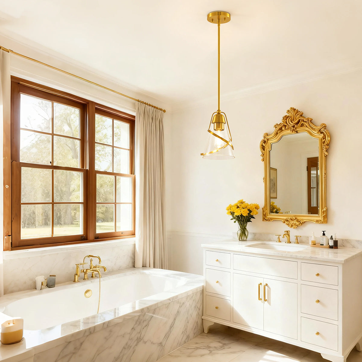 【Sleek Modern Design】: A 7-inch wide pendant featuring a golden iron frame and glass shade for a contemporary look, ideal for dining rooms, bedrooms, or living areas.
