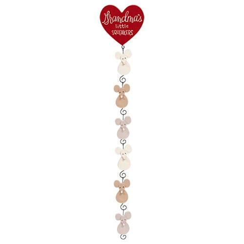 The Grandma’s Little Squeakers Heart is a darling addition to thoughtful decorative displays. A red heart makes the focal point of the piece and features white text that reads “Grandma’s little squeakers” in a mix of script and print fonts. The set includes 6 small mice made with layered wood design in shades of tan, cream, and gray. Each mouse features a curled metal tail that allows them to hang from one another. A grandchild’s name can be written on the blank tummy of each mouse for a more personal touch. The heart measures 4.25” high by 4” wide by .5” deep, and each mouse measures 3.5” high by 1.25” wide by .5” deep.