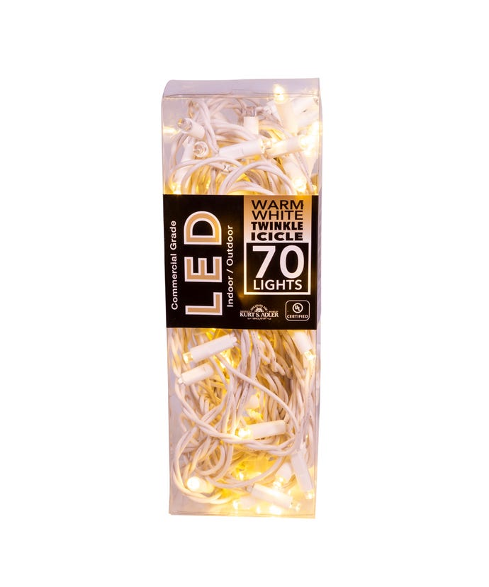 Add to your holiday décor with this 70 light warm white soft twinkle LED icicle light set from Kurt Adler. Each light set includes a 6, 5, 3 sequence for a total of 15 icicle drops and is packaged in an acetate box. This light set offers a variety of uses and would be a terrific addition to any holiday lighting décor.